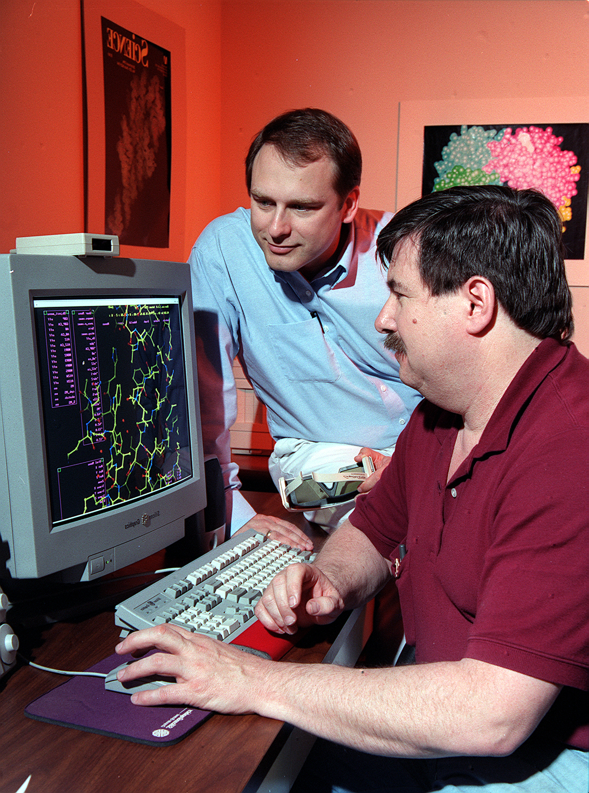Dr. Marc Pusey (seated) and Dr. Craig Kundrot use computers to analyze x-ray maps and generate three-dimensional models of protein structures. With this information, scientists at Marshall Space Flight Center can learn how proteins are made and how they work. The computer screen depicts a proten structure as a ball-and-stick model. Other models depict the actual volume occupied by the atoms, or the ribbon-like structures that are crucial to a protein's function.