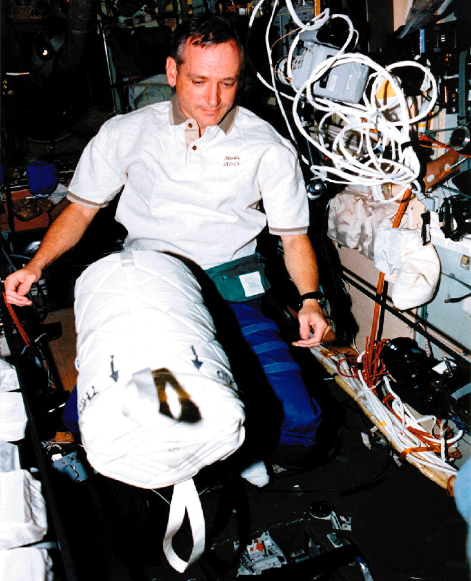 Astronaut Tom Akers places a liquid nitrogen Dewar containing frozen protein solutions aboard Russia's space Station Mir during a visit by the Space Shuttle (STS-79). The protein samples were flash-frozen on Earth and will be allowed to thaw and crystallize in the microgravity environment on Mir Space Station. A later crew will return the Dewar to Earth for sample analysis. Dr. Alexander McPherson of the University of California at Riverside is the principal investigator. Photo credit: NASA/Johnson Space Center.