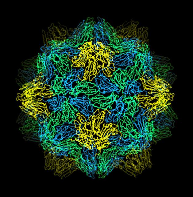 The bumpy exterior of the turnip yellow mosaic virus (TYMV) protein coat, or capsid, was defined in detail by Dr. Alexander McPherson of the University of California, Irvin using protein crystallized in space for analysis on Earth. TYMV is an icosahedral virus constructed from 180 copies of the same protein arranged into 12 clusters of five proteins (pentamers), and 20 clusters of six proteins (hexamers). The final TYMV structure led to the enexpected hypothesis that the virus release its RNA by essentially chemical-mechanical means. Most viruses have farly flat coats, but in TYMV, the fold in each protein, called the jellyroll, is clustered at the points where the protein pentamers and hexamers join. The jellyrolls are almost standing on end, producing a bumpy surface with knobs at all of the pentamers and hexamers. At the inside surface of the pentamers is a void that is not present at the hexamers. The coating had been seen in early studies of TYMV, but McPhereson's atomic structure shows much more detail. The inside surface is strikingly, and unexpectedly, different than the outside. While the pentamers contain a central viod on the inside, the hexameric units contain peptides liked to each other, forming a ring or, more accurately, rings to fill the voild. Credit: Dr. Alexander McPherson, University of California, Irvine.