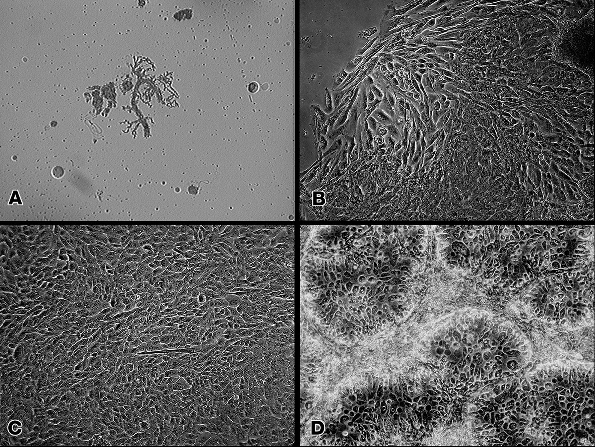 Isolation of human mammary epithelial cells (HMEC) from breast cancer susceptible tissue; A: Duct element recovered from breast tissue digest. B: Outgrowth of cells from duct element in upper right corner cultured in a standard dish; most cells spontaneousely die during early cell divisions, but a few will establish long-term growth. C: Isolate of long-term frowth HMEC from outgrowth of duct element; cells shown soon after isolation and in early full-cell contact growth in culture in a dish. D: same long-term growth HMEC, but after 3 weeks in late full-cell contact growth in a continuous culture in a dish. Note attempts to reform duct elements but this in two demensions in a dish rather than in three dimensions in tissue. NASA's Marshall Space Flight Center (MSFC) is sponsoring research with Bioreactors, rotating wall vessels designed to grow tissue samples in space, to understand how breast cancer works. This ground-based work studies the growth and assembly of human mammary epithelial cell (HMEC) from breast cancer susceptible tissue. Radiation can make the cells cancerous, thus allowing better comparisons of healthy vs. tunorous tissue. Credit: Dr. Robert Richmond, NASA/Marshall Space Flight Center (MSFC).