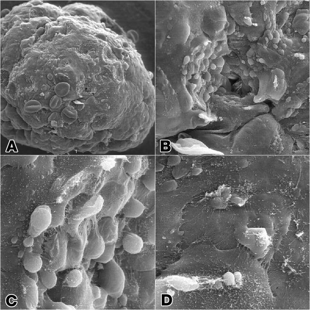 Epithelial cell monoculture: Long-term growth of human mammary epithelial cells (HMEC) grown in monoculture as 3-dimensional constructions in the presence of attachment beads in the NASA Bioreactor. A: A typical construct about 3.5 mm (less than 1/8th inch) in diameter with slightly dehydrted, crinkled beads contained on the surface as well as within the 3-dimensional structure. B: The center of these constructs is hollow. Crinkling of the beads causes a few to fall out, leaving crater-like impressiions in the construct. The central impression shows a small hole that accesses the hollow center of the construct. C: A closeup view of the cells and the hole the central impression. D: Closer views of cells in the construct showing sell-to-cell interactions. NASA's Marshall Space Flight Center (MSFC) is sponsoring research with Bioreactors, rotating wall vessels designed to grow tissue samples in space, to understand how breast cancer works. This ground-based work studies the growth and assembly of human mammary epithelial cell (HMEC) from breast cancer susceptible tissue. Radiation can make the cells cancerous, thus allowing better comparisons of healthy vs. tunorous tissue. Credit: Dr. Robert Richmond, NASA/Marshall Space Flight Center (MSFC).