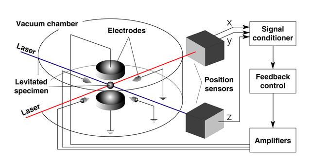 Schematic of Electrostatic Levitator (ESL) electrodes and controls system. The ESL uses static electricity to suspend an object (about 2-3 mm in diameter) inside a vacuum chamber while a laser heats the sample until it melts. This lets scientists record a wide range of physical properties without the sample contacting the container or any instruments, conditions that would alter the readings. The Electrostatic Levitator is one of several tools used in NASA's microgravity materials science program.