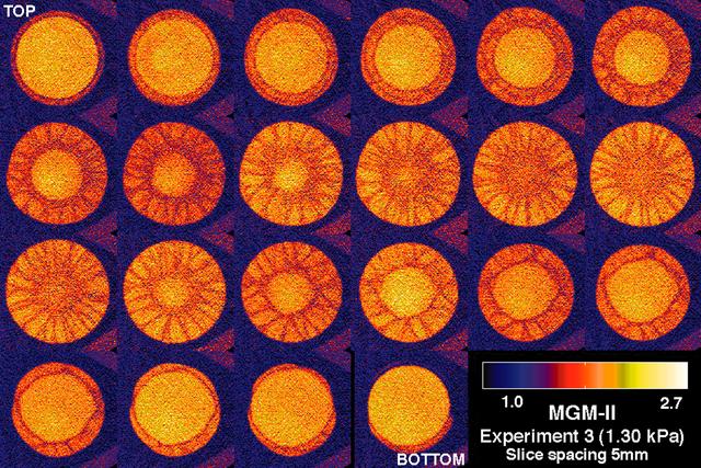 CT scans of the spcimens on STS-79 reveal internal cone-shaped features and radial patterns not seen in specimens processed on the ground. The lighter areas are the densest in these images. CT scans produced richly detailed images allowing scientists to build 3D models of the interior of the specimens that can be compared with microscopic examination of thin slices. This view depict horizontal slices from top to bottom of a flight specimen. Sand and soil grains have faces that can cause friction as they roll and slide against each other, or even cause sticking and form small voids between grains. This complex behavior can cause soil to behave like a liquid under certain conditions such as earthquakes or when powders are handled in industrial processes. Mechanics of Granular Materials (MGM) experiments aboard the Space Shuttle use the microgravity of space to simulate this behavior under conditions that carnot be achieved in laboratory tests on Earth. MGM is shedding light on the behavior of fine-grain materials under low effective stresses. Applications include earthquake engineering, granular flow technologies (such as powder feed systems for pharmaceuticals and fertilizers), and terrestrial and planetary geology. Nine MGM specimens have flown on two Space Shuttle flights. Another three are scheduled to fly on STS-107. The principal investigator is Stein Sture of the University of Colorado at Boulder. Credit: Los Alamos National Laboratory and the University of Colorado at Boulder.
