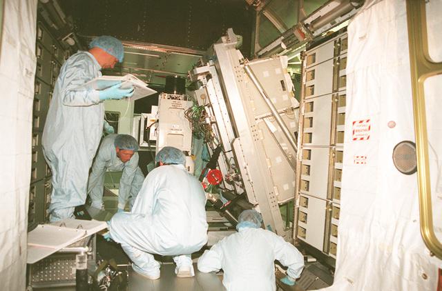 KENNEDY SPACE CENTER, FLA. -- Workers inside the Multi-Purpose Logistics Module Leonardo check connections while installing a laboratory rack. Leonardo is the first of three such pressurized modules that will serve as the International Space Station's “moving vans,” carrying laboratory racks filled with equipment, experiments and supplies to and from the Space Station aboard the Space Shuttle. Approximately 21 feet long and 15 feet in diameter, Leonardo will be launched on Shuttle mission STS-102 March 1, 2001. On that flight, Leonardo will be filled with equipment and supplies to outfit the U.S. laboratory module, being carried to the ISS on the Jan. 19, 2001, launch of STS-98