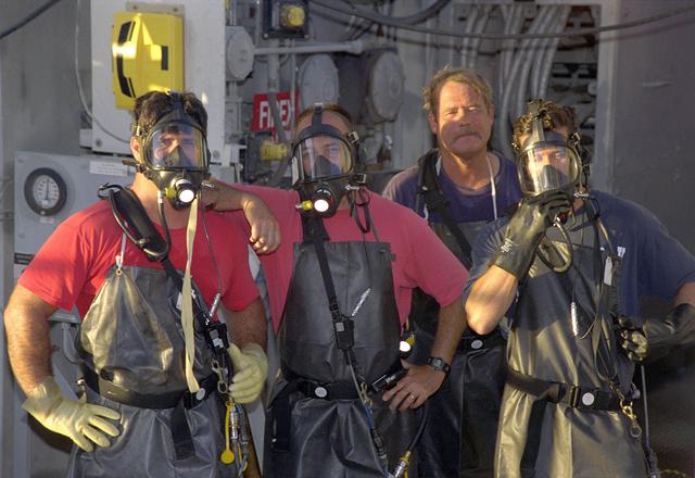 KENNEDY SPACE CENTER, FLA. -- Day in the Life, page 2. Preparing the pad. Workers maintain Pad A at Kennedy Space Center’s Launch Complex 39. A team of United Space Alliance workers don gas masks before calibrating the pad’s hypergolic fuel system. This photograph was taken for a special color edition of Spaceport News designed to portray in photographs a single day at KSC, July 26, 2000. The special edition, published Aug. 25, 2000, was created to give readers a look at KSC’s diverse workforce and the critical roles workers play in the nation’s space program. Spaceport News is an official publication of the Kennedy Space Center and is published on alternate Fridays by the Public Affairs Office in the interest of KSC civil service and contractor employees
