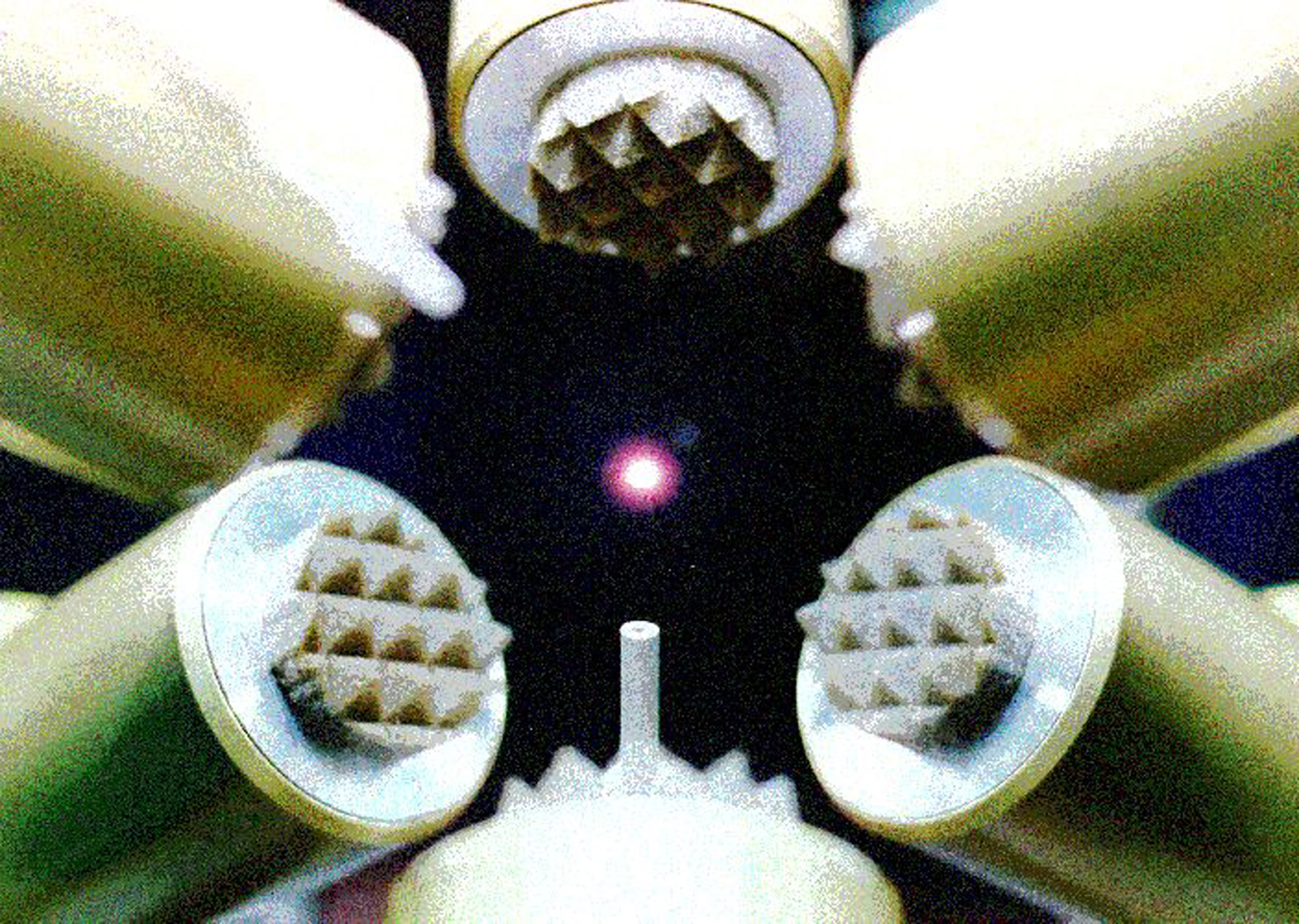 A 3 mm-diameter droplet of aluminum oxide, heated to 2371 deg. C (4,300 deg. F), is suspended in midair by six acoustic transducers. A gas jet (from the nozzle below the drop) helps position the drop for study, and a 500-watt laser melts the sample. Glasses made from aluminum oxide are highly promising for optical transmission and other properties. They are also highly reactive when molten. Containerless processing allows studies of how to form amorphous (glassy) rather than crystalline metal oxides. Credit: Bill Jellison, Containerless Research, Inc.