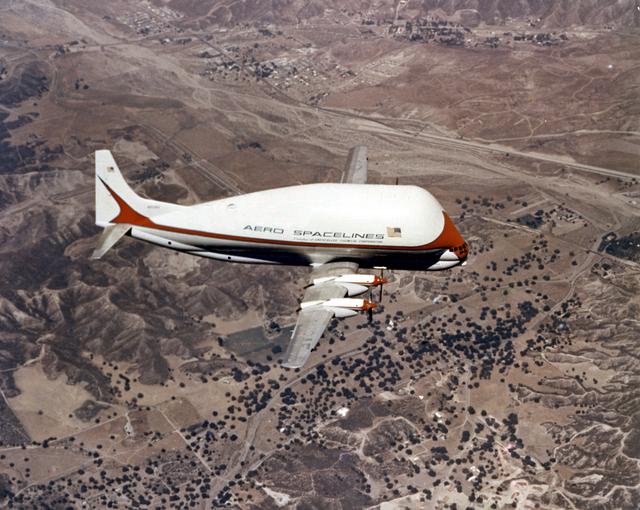 Super Guppy, bigger sister of the aptly named Pregnant Guppy, was the only airplane in the world capable of carrying a complete S-IVB stage. This aircraft was built by John M. Conroy of Aero Spaceliners, Incorporated, who started with the fuselages of a surplus Boeing C-97 Stratocruiser, ballooned out the upper decks enormously, and hinged the front sections so that they could be folded back 110 degrees. The Super Guppy flew smoothly at a 250-mph cruising speed, and its cargo deck provided a 25-foot clear diameter.