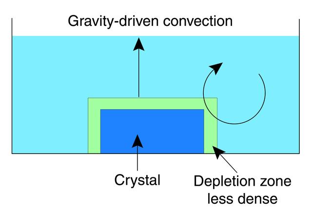 Gravity or density-driven convection occurs as protein molecules incorporate into a crystal lattice from the surrounding solution. The layer bordering the crystal (the depletion zone) then contains a less-dense protein concentration, causing the layer to rise. The remaining, denser solution sinks because of gravity, creating eddies that make it difficult for more protein molecules to attach to the crystal in an ordered way.