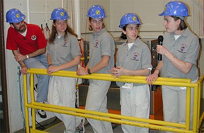The first NASA Dropping In a Microgravity Environment (DIME) student competition pilot project came to a conclusion at the Glenn Research Center in April 2001. The competition involved high-school student teams who developed the concept for a microgravity experiment and prepared an experiment proposal. The two student teams - COSI Academy, sponsored by the Columbus Center of Science and Industry, and another team from Cincinnati, Ohio's Sycamore High School, designed a microgravity experiment, fabricated the experimental apparatus, and visited NASA Glenn to operate their experiment in the 2.2 Second Drop Tower. Here students from Sycamore High School in Cincinnati, Ohio, talk with Dr. Dennis Stocker, one of Glenn's lead microgravity scientists, about the uses of the drop tower. This image is from a digital still camera; higher resolution is not available.