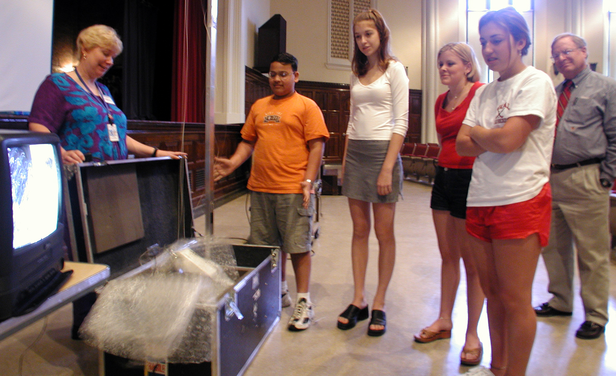 The arnual conference for the Educator Resource Center Network (ERCN) Coordinators was held at Glenn Research Center at Lewis Field in Cleveland, Ohio. The conference included participants from NASA's Educator Resource Centers located throughout the country. The Microgravity Science Division at Glenn sponsored a Microgravity Day for all the conference participants. Dr. Wil Roberson and Marge Lehky prepare a demonstration with the mini-drop tower. This image is from a digital still camera; higher resolution is not available.