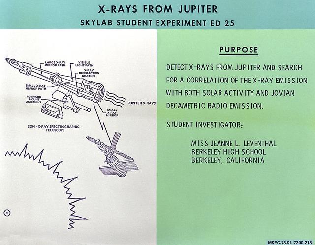 This chart describes the Skylab student experiment X-Rays from Jupiter, proposed by Jearne Leventhal of Berkeley, California. This experiment was an investigation to detect x-rays from the planet Jupiter and determine any correlation with solar flare activity. In March 1972, NASA and the National Science Teachers Association selected 25 experiment proposals for flight on Skylab. Science advisors from the Marshall Space Flight Center aided and assisted the students in developing the proposals for flight on Skylab.