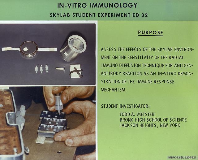 This chart describes the Skylab student experiment In-Vitro Immunology, proposed by Todd A. Meister of Jackson Heights, New York. He suggested an in-vitro observation of the effects of zero-gravity on a presipitin-type antigen-antibody reaction, as compared with the same reaction carried out in an Earth-based laboratory. In March 1972, NASA and the National Science Teachers Association selected 25 experiment proposals for flight on Skylab. Science advisors from the Marshall Space Flight Center aided and assisted the students in developing the proposals for flight on Skylab.