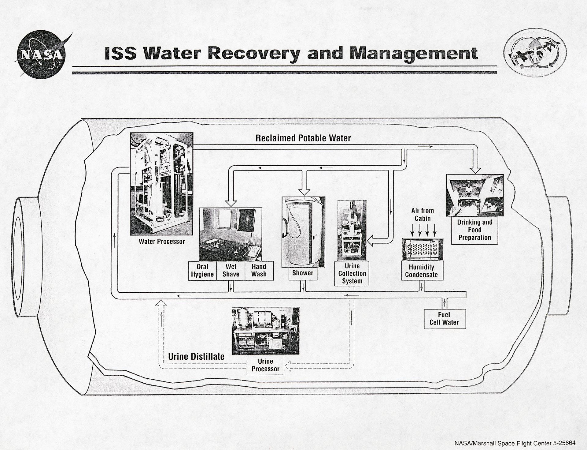 This diagram shows the flow of water recovery and management in the International Space Station (ISS). The Environmental Control and Life Support System (ECLSS) Group of the Flight Projects Directorate at the Marshall Space Flight Center is responsible for the regenerative ECLSS hardware, as well as providing technical support for the rest of the system. The regenerative ECLSS, whose main components are the Water Recovery System (WRS), and the Oxygen Generation System (OGS), reclaims and recycles water oxygen. The ECLSS maintains a pressurized habitation environment, provides water recovery and storage, maintains and provides fire detection/ suppression, and provides breathable air and a comfortable atmosphere in which to live and work within the ISS. The ECLSS hardware will be located in the Node 3 module of the ISS.