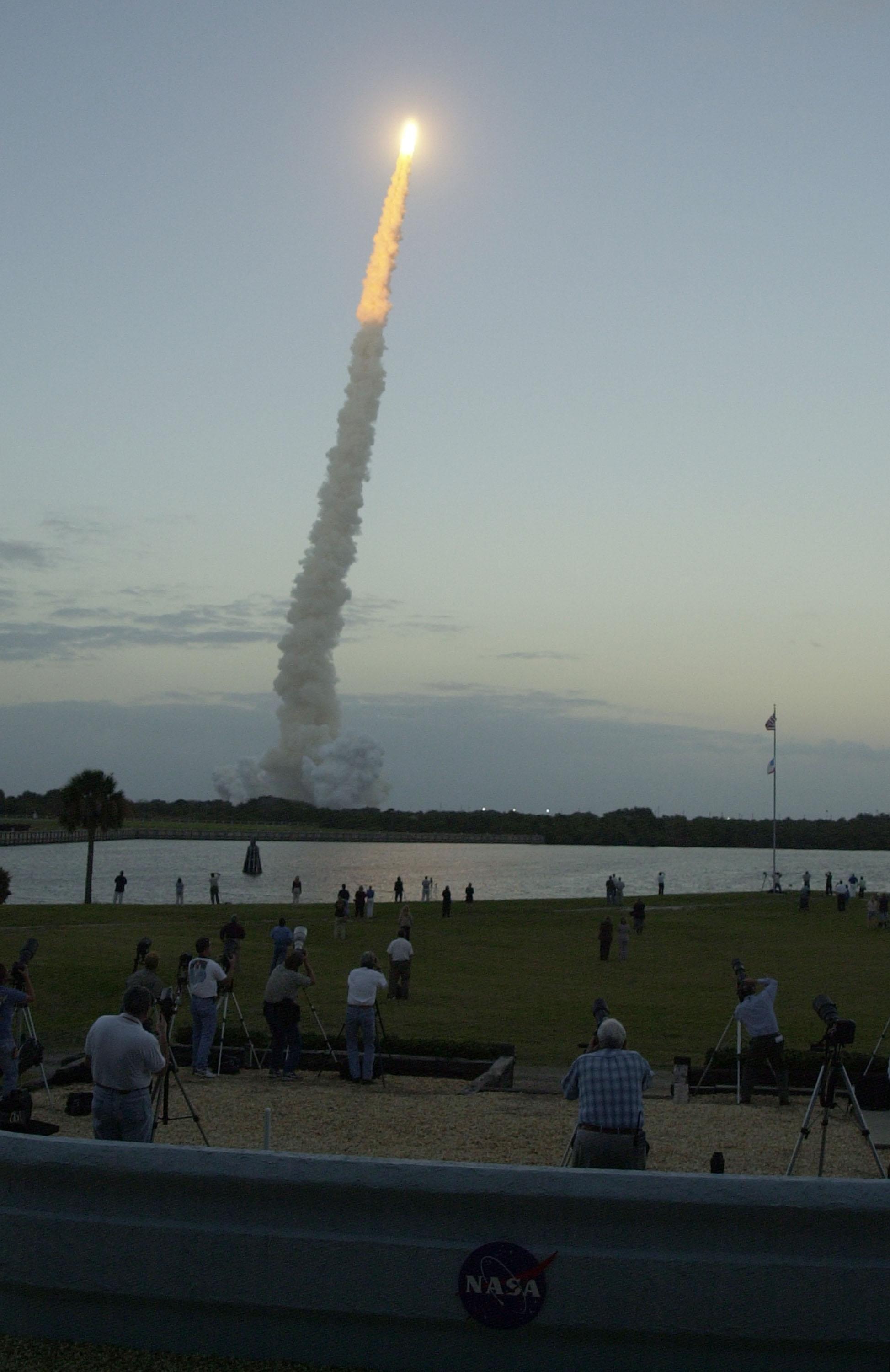 KENNEDY SPACE CENTER, Fla. -- Space Shuttle Endeavour soars into a twilight sky on mission STS-108, the second attempt over two days. Liftoff occurred at 5:19:28 p.m. EST (22:19 GMT). Endeavour will dock with the International Space Station on Dec. 7. STS-108 is the final Shuttle mission of 2001and the 107th Shuttle flight overall. It is the 12th flight to the Space Station. Landing of the orbiter at KSC's Shuttle Landing Facility is targeted for 1:05 p.m. EST (18:05 p.m. GMT) Dec. 16