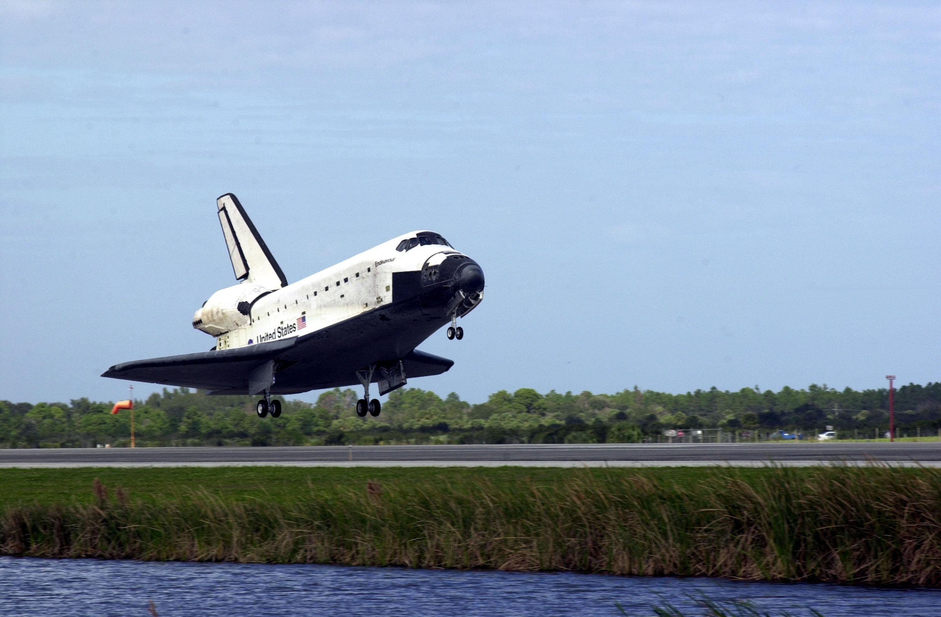 KENNEDY SPACE CENTER, FLA. -- Orbiter Endeavour drops through scattered clouds to land on Runway 15 at the KSC Shuttle Landing Facility, completing mission STS-108. After a mission-elapsed time of 11 days, 19 hours and 35 minutes, the landing is the 57th at KSC in the history of the program. Main gear touchdown occurred at 12:55:10 p.m. EST (17:55:10 GMT), nose gear touchdown at 12:55:23 p.m. (17:55:23 GMT) , wheel stop at 12:56:13 p.m. (17:56:13 GMT). STS-108 was the 12th mission to the International Space Station. This mission was the 107th flight in the Shuttle program and the 17th flight for the orbiter. Endeavour carries both the mission crew and the Expedition 3 crew - Commander Frank Culbertson and cosmonauts Vladimir Dezhurov and Mikhail Tyurin - who are returning to Earth after 129 days in space on the Space Station