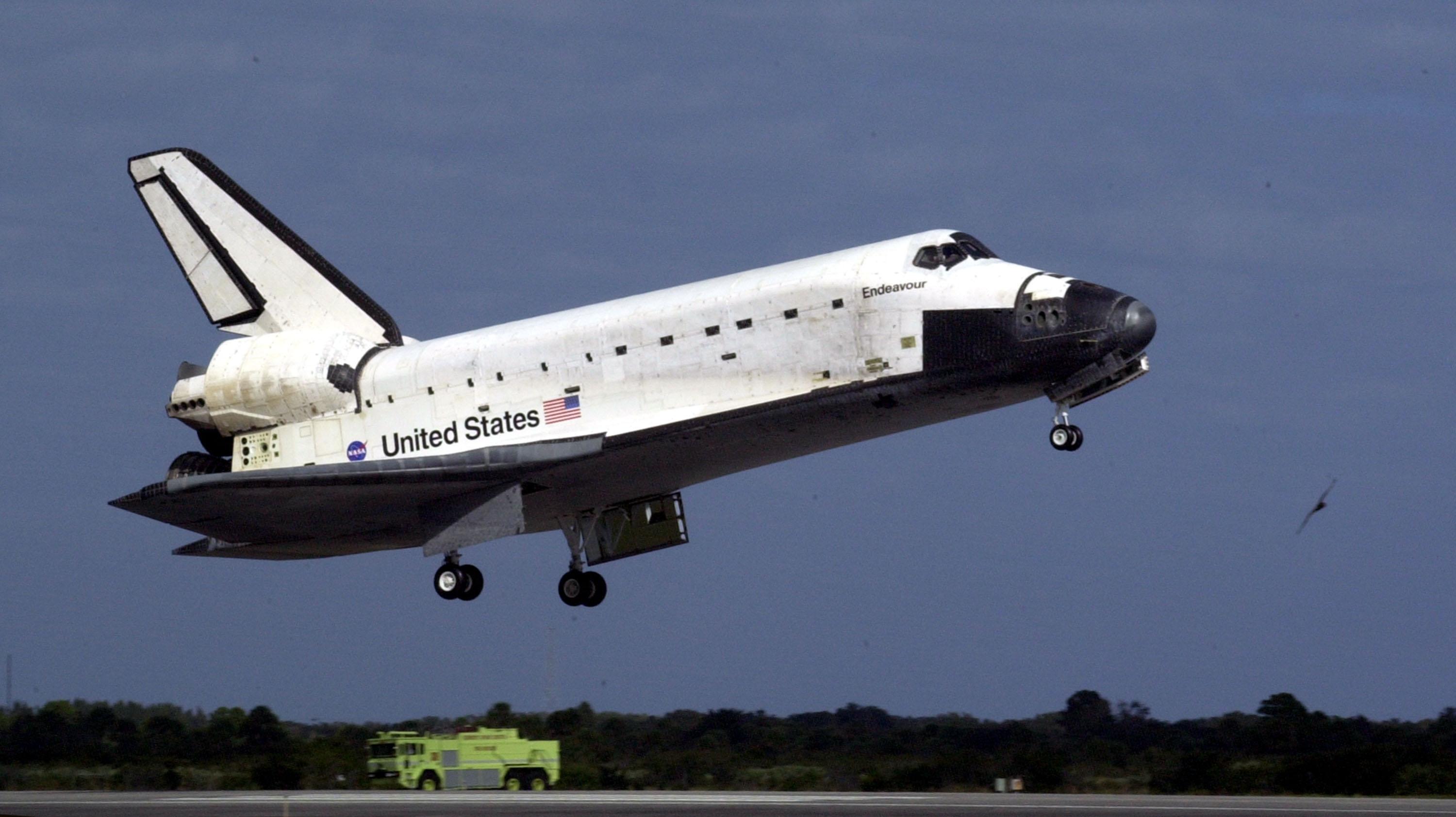 KENNEDY SPACE CENTER, FLA. -- A safety vehicle waits near Runway 15 at the Shuttle Landing Facility as orbiter Endeavour approaches for a landing, completing mission STS-108 after a mission-elapsed time of 11 days, 19 hours and 35 minutes. The landing is the 57th at KSC in the history of the program. Main gear touchdown occurred at 12:55:10 p.m. EST (17:55:10 GMT), nose gear touchdown at 12:55:23 p.m. (17:55:23 GMT) , wheel stop at 12:56:13 p.m. (17:56:13 GMT). STS-108 was the 12th mission to the International Space Station. This mission was the 107th flight in the Shuttle program and the 17th flight for the orbiter. Endeavour carries both the mission crew and the Expedition 3 crew - Commander Frank Culbertson and cosmonauts Vladimir Dezhurov and Mikhail Tyurin - who are returning to Earth after 129 days in space on the Space Station