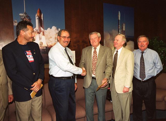 KENNEDY SPACE CENTER, Fla. -- ISS International Partners donate funds to the Combined Federal Campaign and United Way at KSC to benefit the Sept. 11 recovery efforts. From left are Steve Mozes of the Canadian Space Agency, Agostino Verghini of the Italian Space Agency, Frank Ramsey of United way, Center Director Roy D. Bridges Jr. and Director of International Space Station_Payload Processing Tip Talone