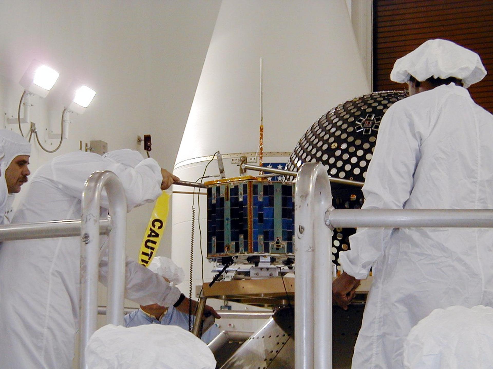 KODIAK ISLAND, Alaska -- The Sapphire payload is moved into position next to the Starshine 3 payload at Kodiak Island, Alaska, as preparations to launch Kodiak Star proceed. The first orbital launch to take place from Alaska's Kodiak Launch Complex, Kodiak Star is scheduled to lift off on a Lockheed Martin Athena I launch vehicle on Sept. 17 during a two-hour window that extends from 5 p.m. to 7 p.m. p.m. ADT. The payloads aboard include the Starshine 3, sponsored by NASA, and the PICOSat, PCSat and Sapphire, sponsored by the Department of Defense (DoD) Space Test Program.