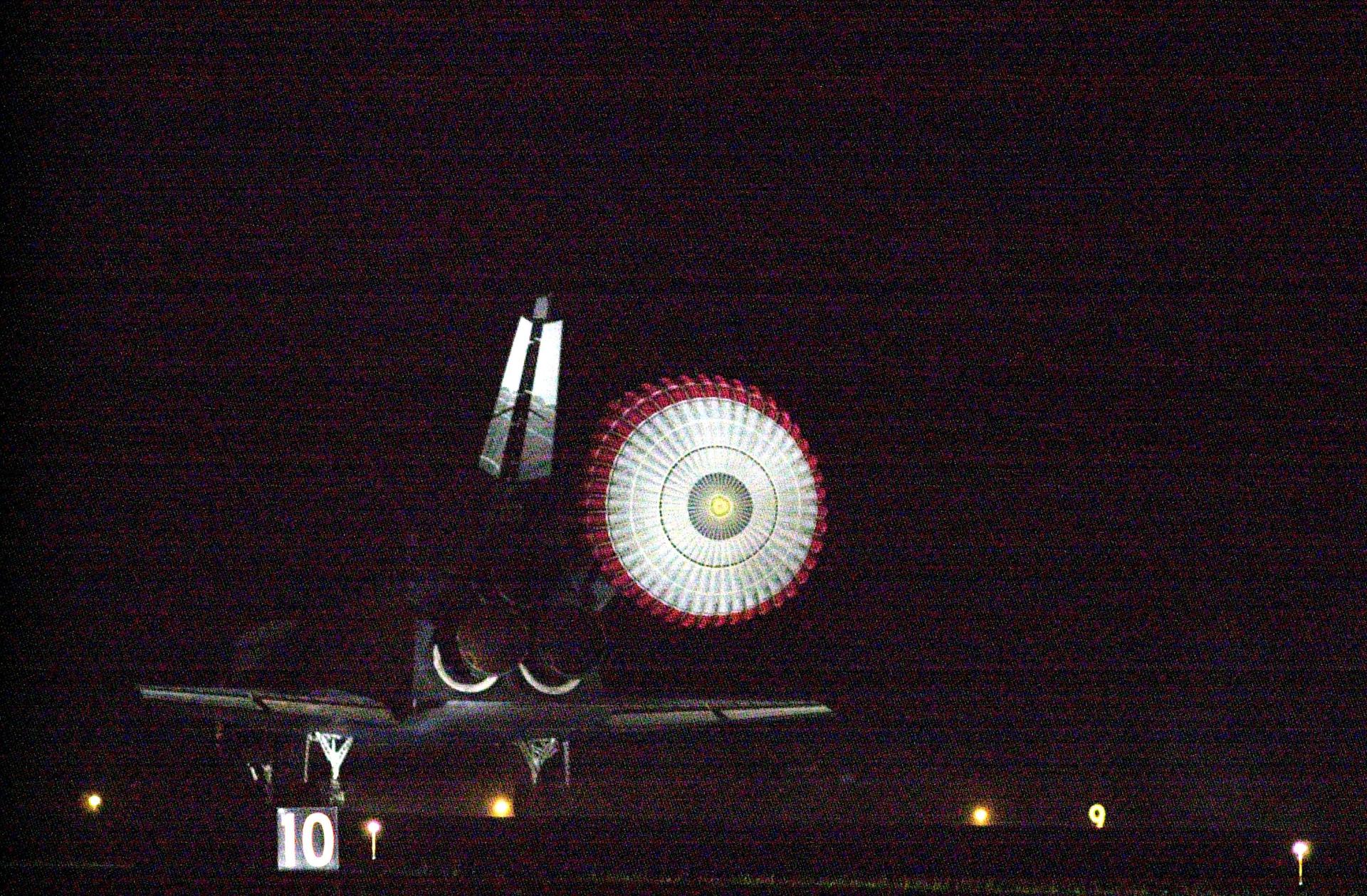 KENNEDY SPACE CENTER, Fla. -- With the drag chute slowing its speed, Atlantis prepares to land on Runway 15 at the Shuttle Landing Facility to complete a 12-day, 18-hour, 34-minute-long STS-104 mission. Main gear touchdown occurred at 11:38:55 p.m. EDT. At the controls is Commander Steven W. Lindsey. Other crew members on board are Pilot Charles Hobaugh and Mission Specialists Michael Gernhardt, Janet Lynn Kavandi and James F. Reilly. This is the 18th nighttime landing for a Space Shuttle, the 13th at Kennedy Space Center. The mission delivered the Joint Airlock Module to the International Space Station, completing the second phase of the assembly of the Space Station