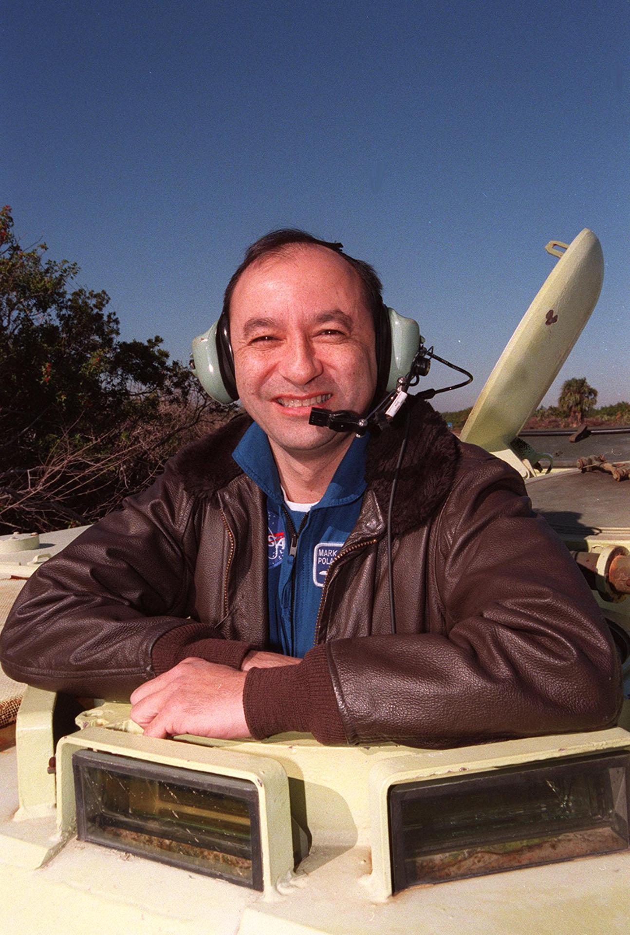 A smiling Mark Polansky, the pilot on STS-98, gets ready to take the driver’s seat in an M-113 armored carrier, part of emergency egress training at Launch Pad 39A. In the event of an emergency at the pad prior to launch, the carrier could be used to transport the crew to a nearby bunker or farther. The STS-98 crew is at KSC to take part in Terminal Countdown Demonstration Test activities, which also includes a simulated launch countdown. STS-98 is the seventh construction flight to the International Space Station, carrying as payload the U.S. Lab Destiny, a key element in the construction of the ISS