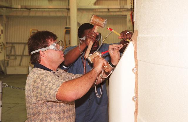 KENNEDY SPACE CENTER, FLA. -- In the Vehicle Assembly Building, Richard Bruns and Henry Jones, United Space Alliance SRB technicians, begin to detach the SRB system tunnel cover on the 36 cables inside. The SRB is part of Space Shuttle Atlantis, rolled back from Launch Pad 39A in order to conduct tests on the cables. A prior extensive evaluation of NASA’s SRB cable inventory on the shelf revealed conductor damage in four (of about 200) cables. Shuttle managers decided to prove the integrity of the system tunnel cables already on Atlantis before launching. Workers are conducting inspections, making continuity checks and conducting X-ray analysis on the cables. The launch has been rescheduled no earlier than Feb. 6. <br