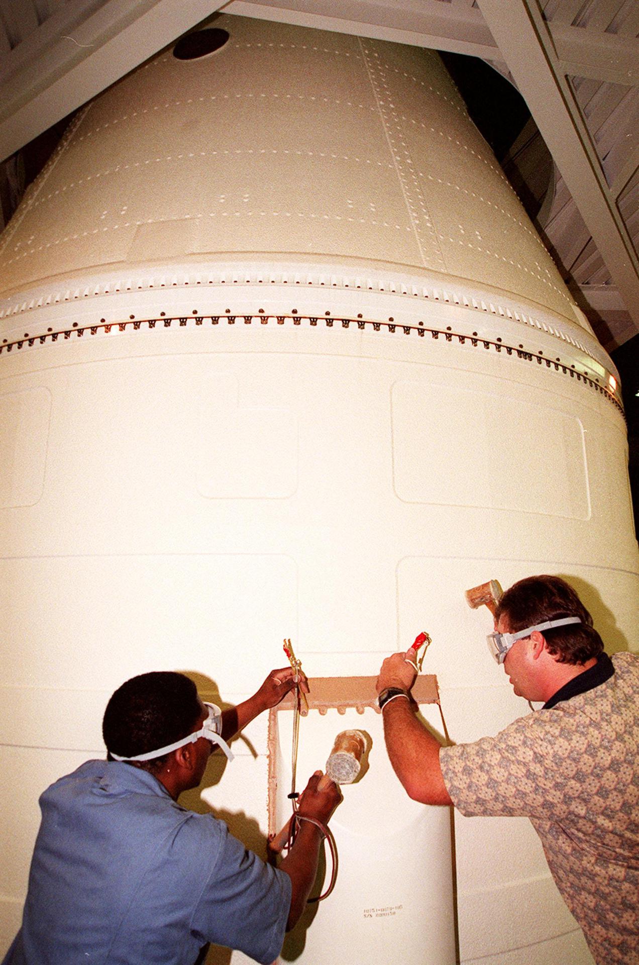 KENNEDY SPACE CENTER, FLA. -- In the Vehicle Assembly Building, near the top of the solid rocket booster, Henry Jones and Richard Bruns begin to detach the SRB system tunnel cover on the 36 cables inside. Jones and Bruns are United Space Alliance SRB technicians. The SRB is part of Space Shuttle Atlantis, rolled back from Launch Pad 39A in order to conduct tests on the cables. A prior extensive evaluation of NASA’s SRB cable inventory on the shelf revealed conductor damage in four (of about 200) cables. Shuttle managers decided to prove the integrity of the system tunnel cables already on Atlantis before launching. Workers are conducting inspections, making continuity checks and conducting X-ray analysis on the cables. The launch has been rescheduled no earlier than Feb. 6.<br