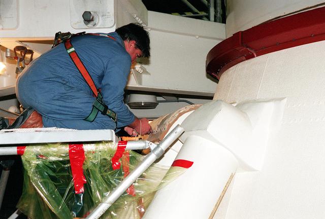 KENNEDY SPACE CENTER, FLA. -- Near the bottom of the solid rocket booster in the Vehicle Assembly Building, a United Space Alliance SRB technician detaches the SRB system tunnel cover on the 36 cables inside. The SRB is part of Space Shuttle Atlantis, rolled back from Launch Pad 39A in order to conduct tests on the cables. A prior extensive evaluation of NASA’s SRB cable inventory on the shelf revealed conductor damage in four (of about 200) cables. Shuttle managers decided to prove the integrity of the system tunnel cables already on Atlantis before launching. Workers are conducting inspections, making continuity checks and conducting X-ray analysis on the cables. The launch has been rescheduled no earlier than Feb. 6