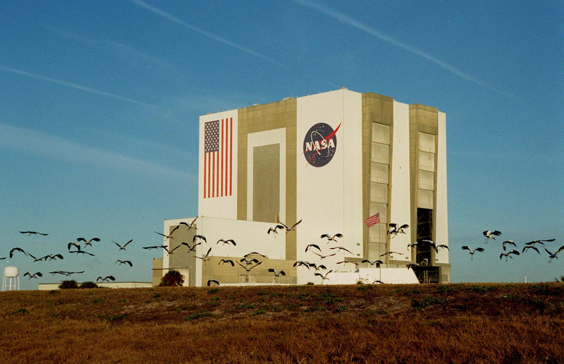 KENNEDY SPACE CENTER, Fla. -- Dozens of storks are roused from the ground near the Vehicle Assembly Building after the Space Shuttle Atlantis has moved out. The Shuttle has been in the VAB undergoing tests on the solid rocket booster cables. A prior extensive evaluation of NASA’s SRB cable inventory on the shelf revealed conductor damage in four (of about 200) cables. Shuttle managers decided to prove the integrity of the system tunnel cables already on Atlantis, causing return of the Shuttle to the VAB a week ago. The Shuttle rolled back to Launch Pad 39A to get ready for launch on Feb. 7 at 6:11 p.m. EST