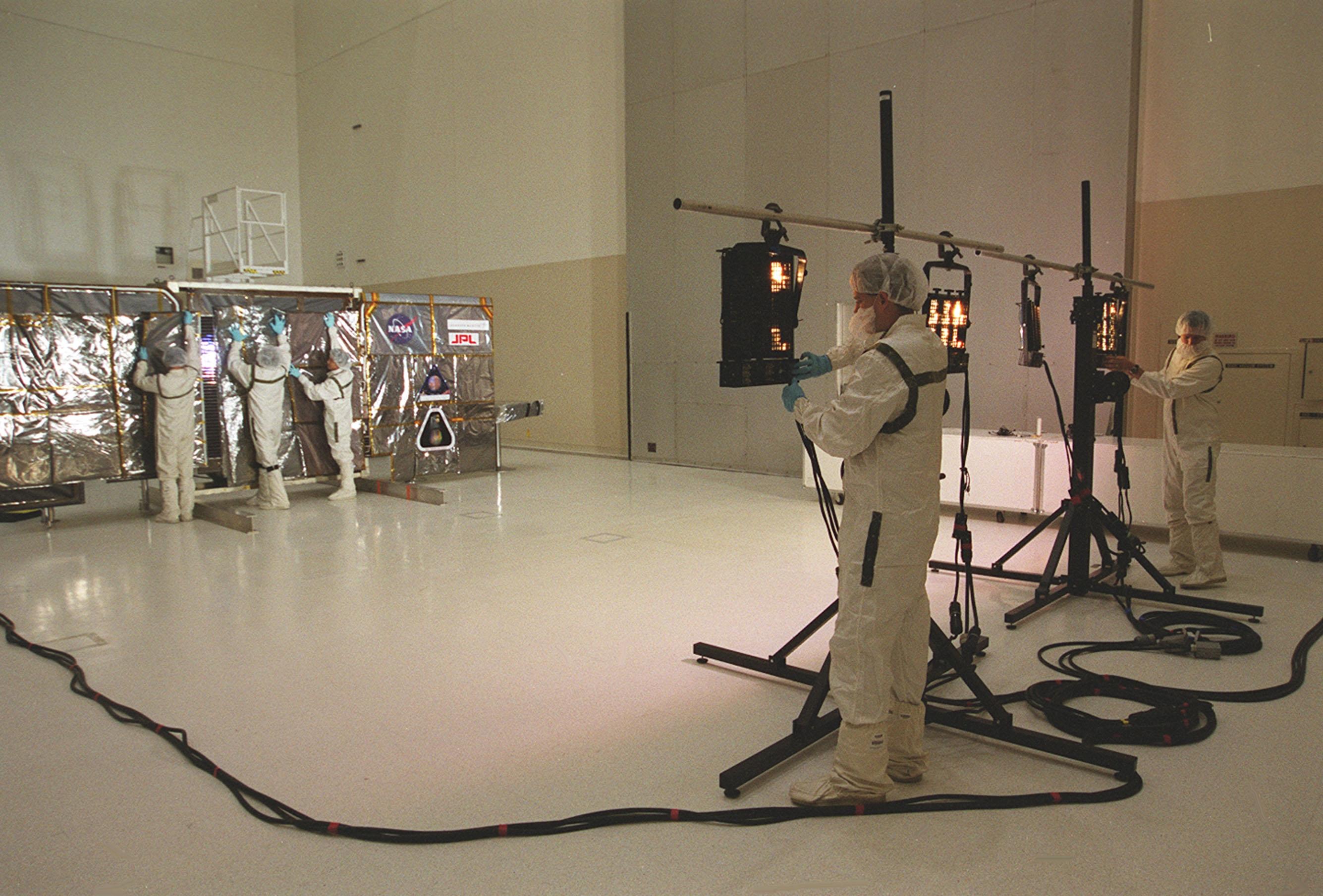 Workers set up illumination testing for the Mars Odyssey solar panels. The orbiter will carry three science instruments: THEMIS, the Gamma Ray Spectrometer (GRS), and the Mars Radiation Environment Experiment (MARIE). THEMIS will map the mineralogy and morphology of the Martian surface using a high-resolution camera and a thermal infrared imaging spectrometer. The GRS will achieve global mapping of the elemental composition of the surface and determine the abundance of hydrogen in the shallow subsurface. The MARIE will characterize aspects of the near-space radiation environment with regards to the radiation-related risk to human explorers. The Mars Odyssey Orbiter is scheduled for launch on April 7, 2001, aboard a Delta 7925 rocket from Launch Pad 17-A, Cape Canaveral Air Force Station