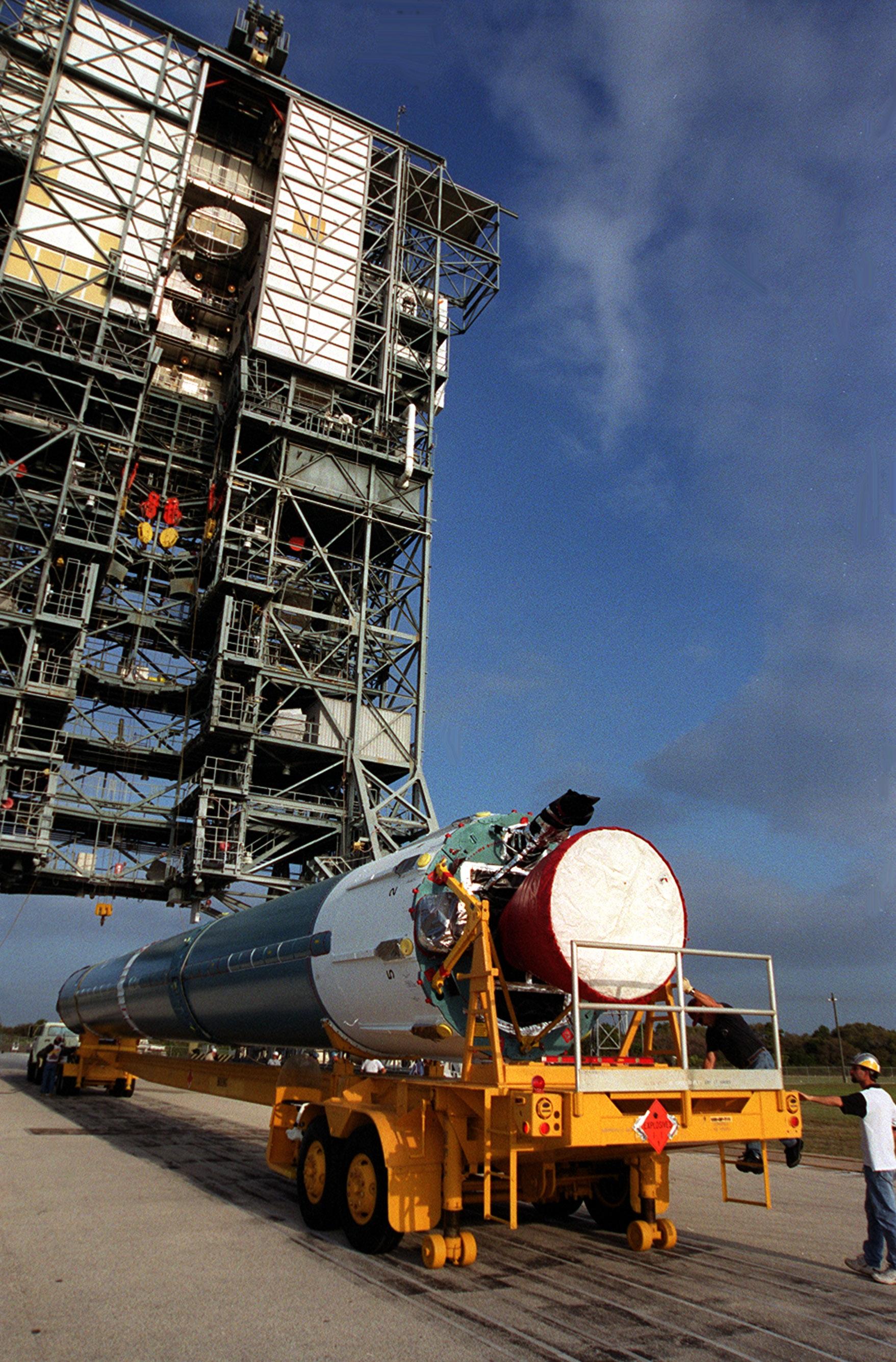 The first stage of a Boeing Delta rocket arrives on Launch Pad 17-A, Cape Canaveral Air Force Station. The rocket will carry the 2001 Mars Odyssey Orbiter, scheduled for launch April 7, 2001. Mars Odyssey contains three science instruments: THEMIS, the Gamma Ray Spectrometer (GRS), and the Mars Radiation Environment Experiment (MARIE). THEMIS will map the mineralogy and morphology of the Martian surface using a high-resolution camera and a thermal infrared imaging spectrometer. The GRS will achieve global mapping of the elemental composition of the surface and determine the abundance of hydrogen in the shallow subsurface. The MARIE will characterize aspects of the near-space radiation environment with regards to the radiation-related risk to human explorers