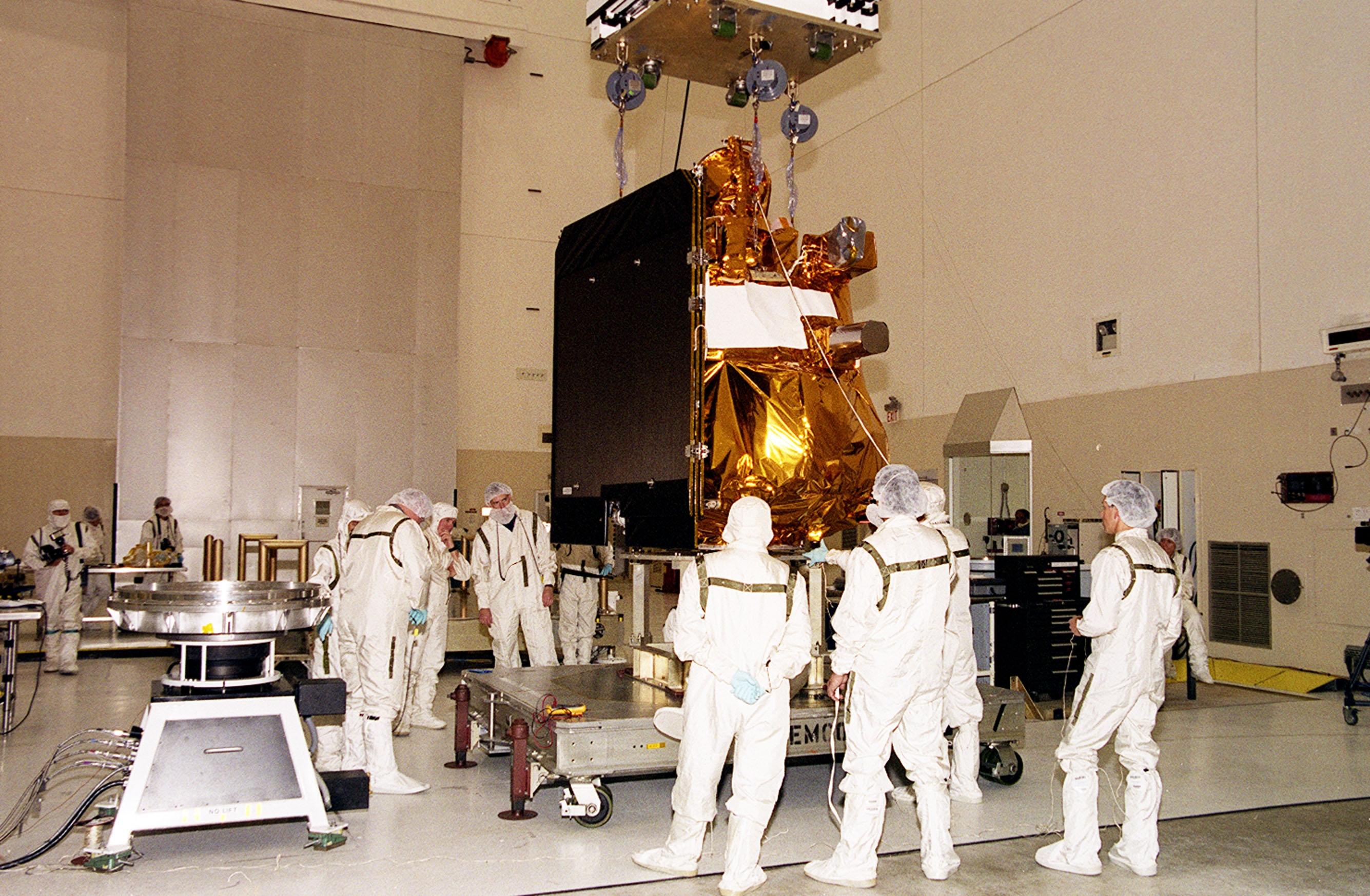 The 2001 Mars Odyssey Orbiter, suspended by an overhead crane in the Space Assembly and Encapsulation Building 2, moves toward the spin table at left where it will be tested. The orbiter is being transferred to a spin table for testing. The orbiter carries three science instruments THEMIS, the Gamma Ray Spectrometer (GRS), and the Mars Radiation Environment Experiment (MARIE) that will map the mineralogy and morphology of the Martian surface, the elemental composition of the surface and determine the abundance of hydrogen in the shallow subsurface, and characterize aspects of the near-space radiation environment with regards to the radiation-related risk to human explorers. The Mars Odyssey Orbiter is scheduled for launch on April 7, 2001, aboard a Delta II rocket from Launch Pad 17-A, Cape Canaveral Air Force Station