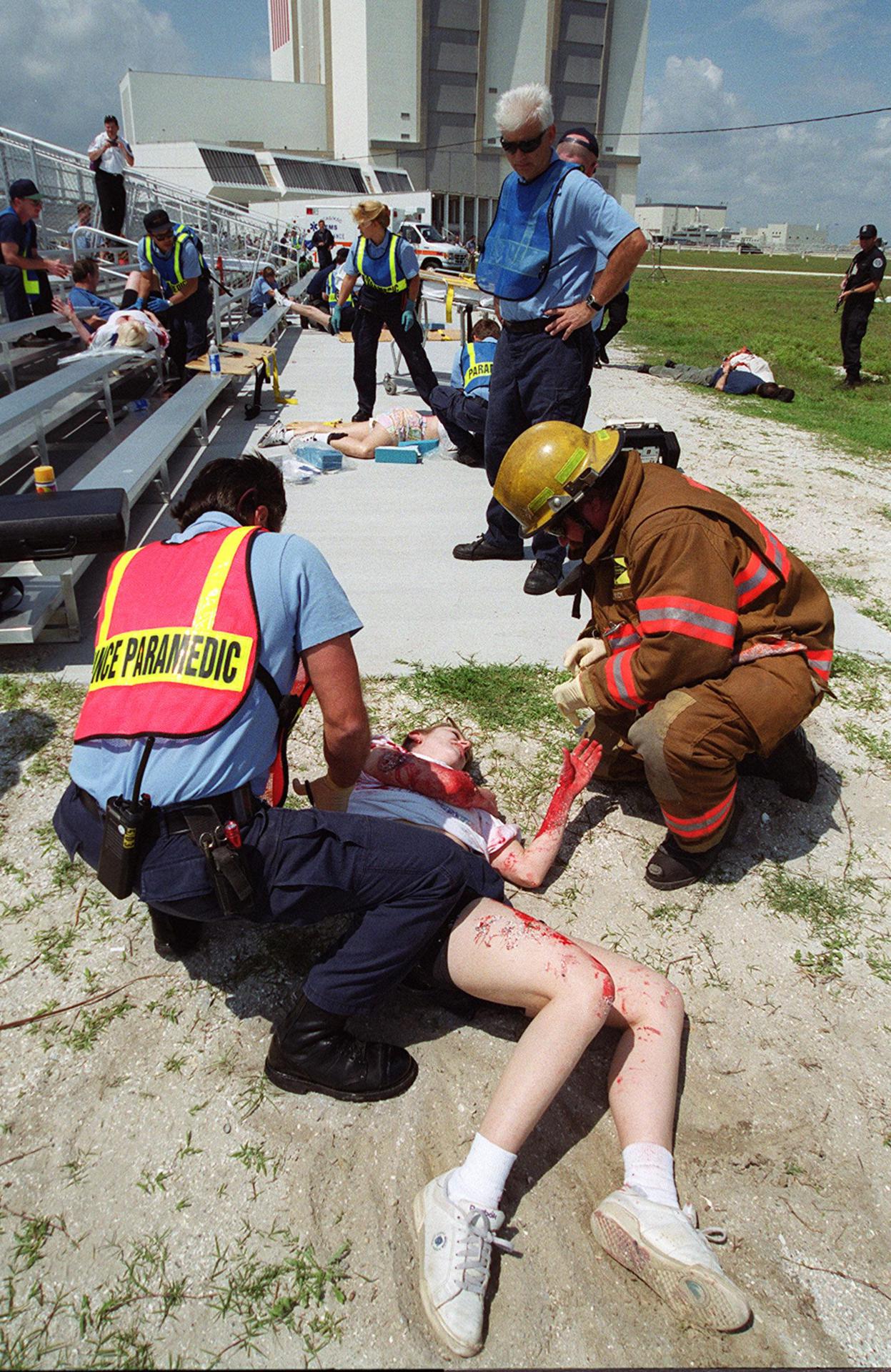 KENNEDY SPACE CENTER, FLA. -- During a staged mass casualty exercise in the Launch Complex 39 area, a paramedic checks an injured woman on the ground. Employees are playing the role of victims during a sniper scenario. The exercise is being staged to validate capabilities of KSC’ fire, medical, helicopter transport and security personnel to respond to such an event.