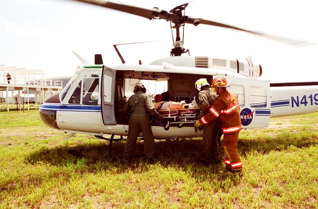 KENNEDY SPACE CENTER, FLA. -- Rescue personnel place a “victim” in a medevac helicopter during a staged mass casualty exercise in the Launch Complex 39 area. Employees are playing roles in the fictitious sniper attack that is being staged to validate capabilities of KSC’s fire, medical, helicopter transport and security personnel to respond to such an event