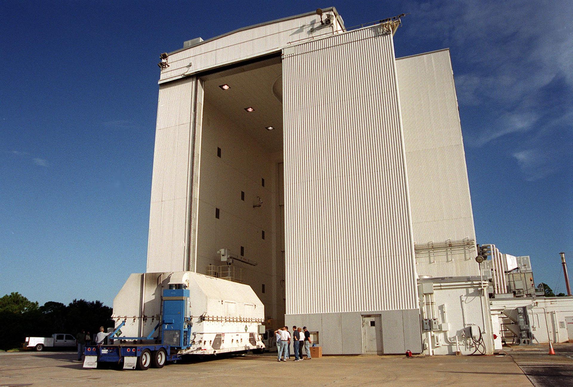 KENNEDY SPACE CENTER, Fla. -- Part of the equipment to be used on mission STS-109, servicing the Hubble Space Telescope, is moved into a facility at KSC. The primary servicing tasks of the mission are to replace Solar Array 2 with Solar Array 3, replace the Power Control Unit, remove the Faint Object Camera and install the Advanced Camera for Surveys, install the NICMOS Cooling System, and install New Outer Blanket Insulation on bays 5 through 8. Mission STS-109 is scheduled for launch in mid-February 2002