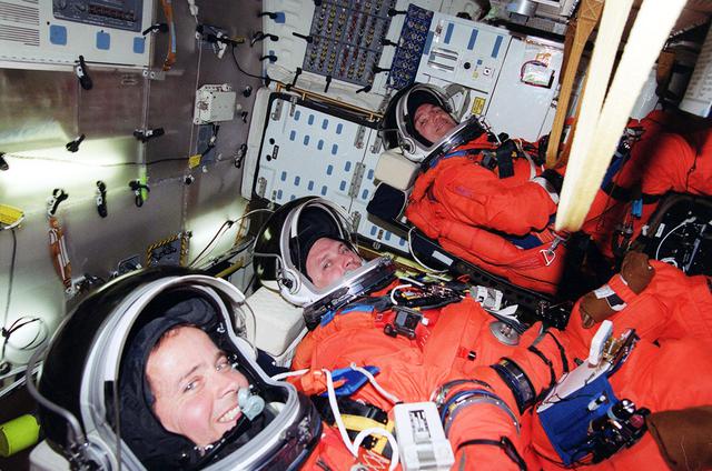 KENNEDY SPACE CENTER, Fla. -- The Expedition 4 crew take their seats in Space Shuttle Endeavour prior to a simulated launch countdown. From left are astronaut Daniel W. Bursch, cosmonaut Yuri Onufrienko, commander, and astronaut Carl E. Walz. Expedition 4, which is the replacement resident crew for the International Space Station, is traveling to the Space Station as part of mission STS-108. The simulated countdown is part of Terminal Countdown Demonstration Test activities, which have also included emergency exit training from the orbiter. Launch of Space Shuttle Endeavour on mission STS-108 is scheduled for Nov. 29 at 7:44 p.m. EST
