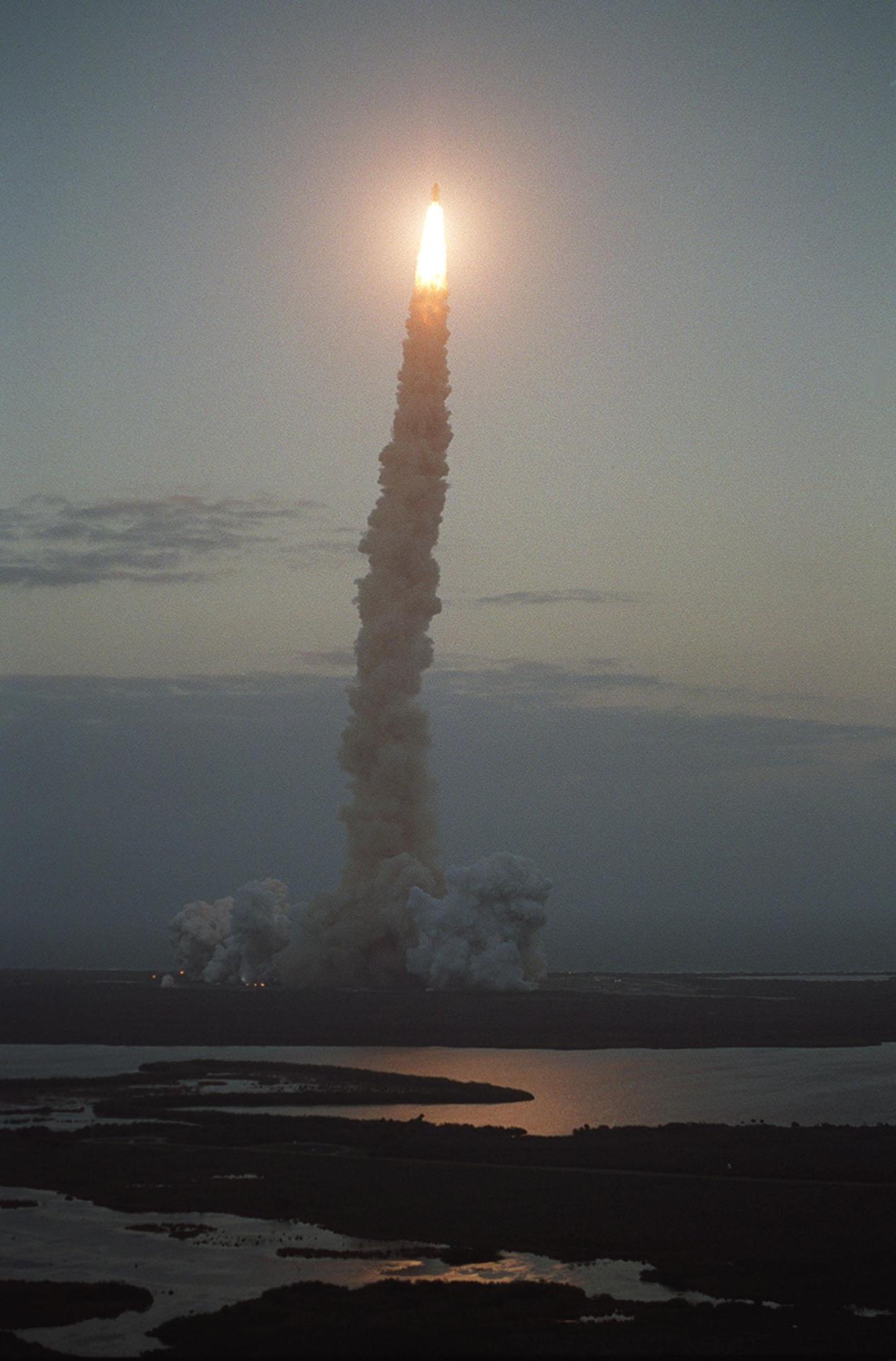 KENNEDY SPACE CENTER, FLA. -- Like a lighted candle, Space Shuttle Endeavour appears like a flame atop its twisted column of smoke as it soars into space on mission STS-108. Liftoff occurred at 5:19:28 p.m. EST (22:19.28 GMT). Endeavour will dock with the International Space Station on Dec. 7. STS-108 is the final Shuttle mission of 2001and the 107th Shuttle flight overall. It is the 12th flight to the Space Station. Landing of the orbiter at KSC's Shuttle Landing Facility is targeted for 1:05 p.m. EST (18:05 p.m. GMT) Dec. 16