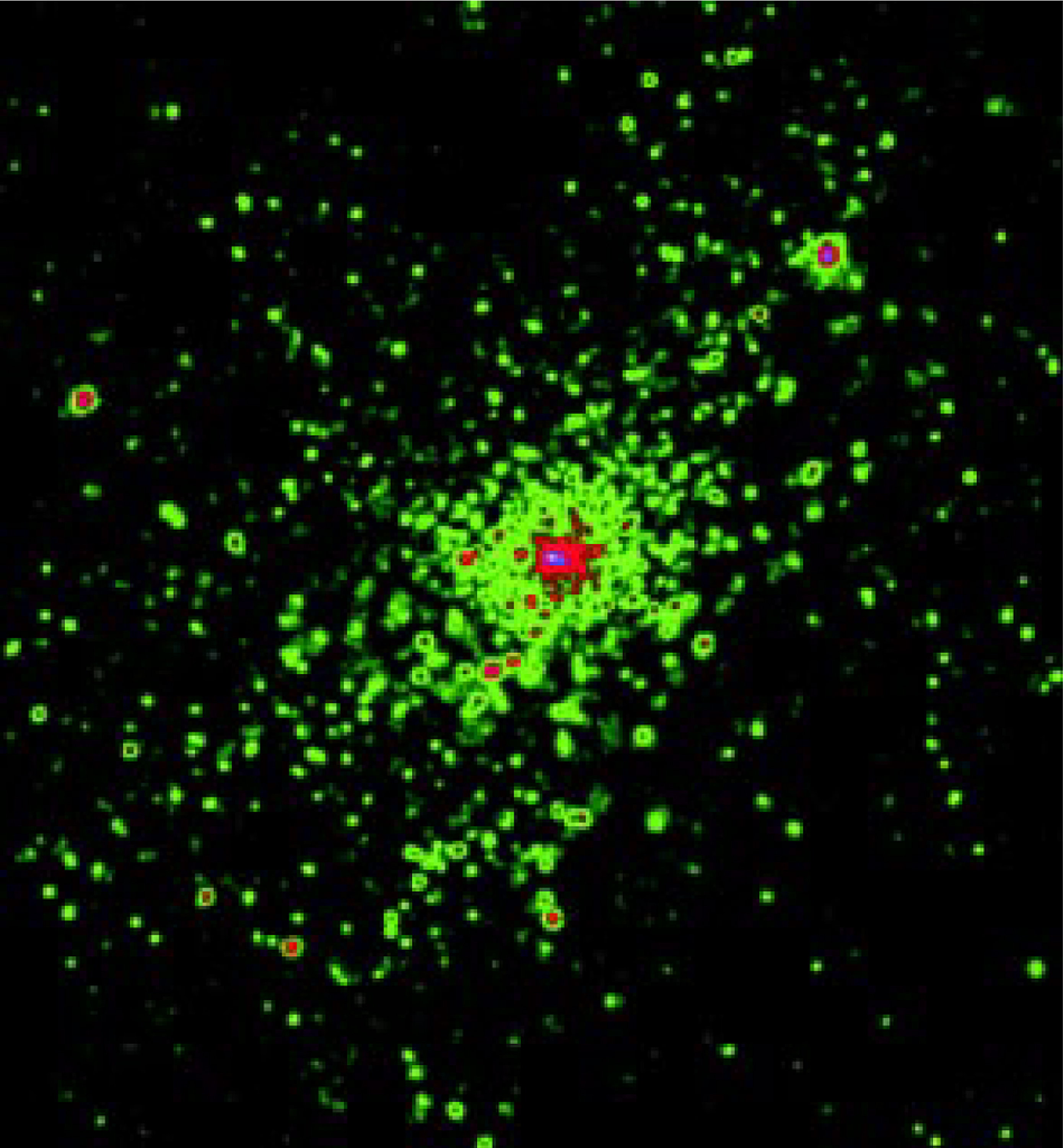 NGC 3603 is a bustling region of star birth in the Carina spiral arm of the Milky Way galaxy, about 20,000 light-years from Earth. For the first time, this Chandra image resolves the multitude of individual x-ray sources in this star-forming region. (The intensity of the x-rays observed by Chandra are depicted by the various colors in this image. Green represents lower intensity sources, while purple and red indicate increasing x-ray intensity.) Specifically, the Chandra image reveals dozens of extremely massive stars born in a burst of star formation about 2 million years ago. This region's activities may be indicative of what is happening in other distant "starburst" galaxies (bright galaxies flush with new stars). In the case of NGC 3603, scientists now believe that these x-rays are emitted from massive stars and stellar winds, since the stars are too young to have produced supernovae or have evolved into neutron stars. The Chandra observations of NGC 3603 may provide new clues about x-ray emission in starburst galaxies as well as star formation itself. (Photo credit: NASA/GSFC/M. Corcoran et al)