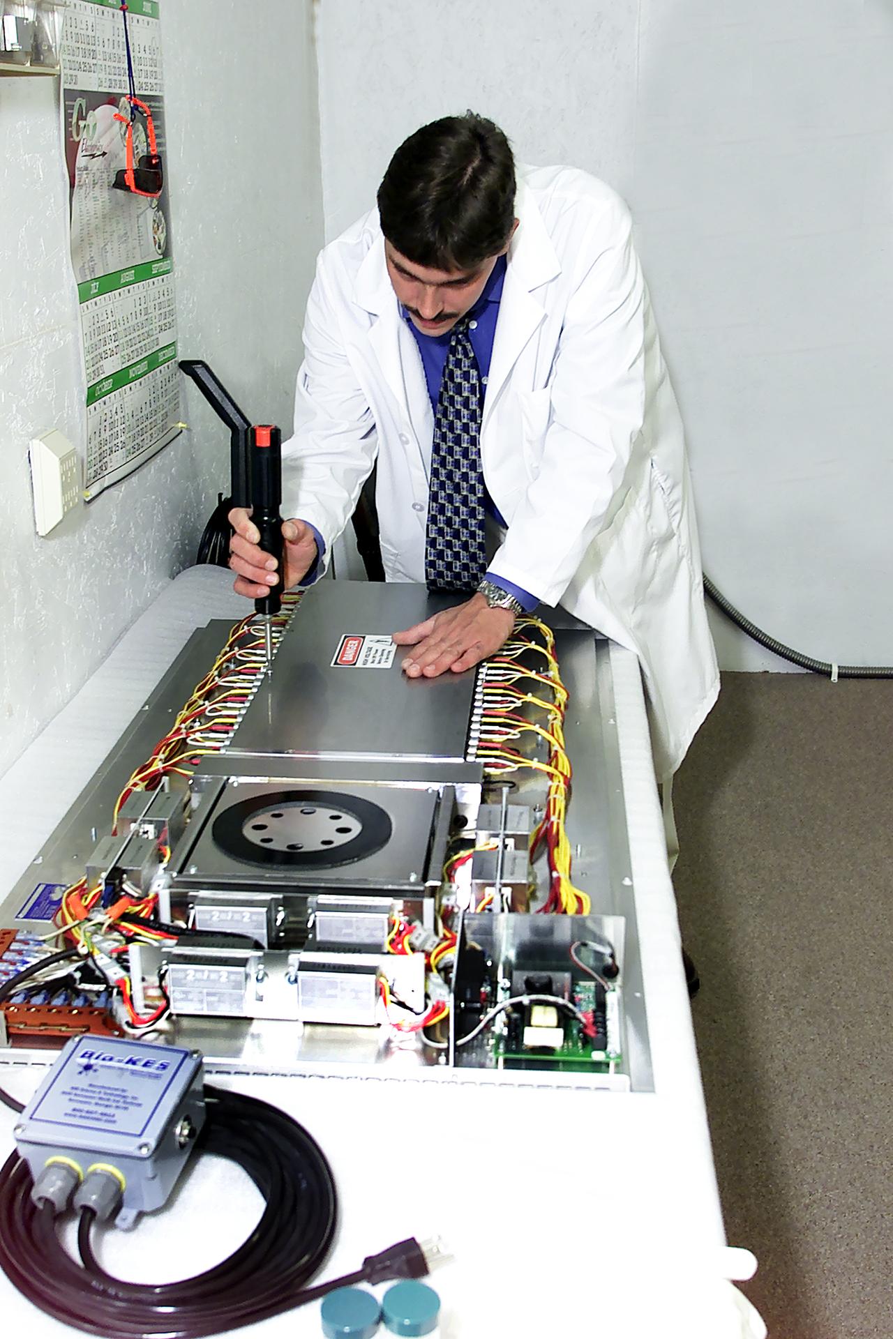 This is a photo of a technician at KES Science and Technology Inc., in Kernesaw, Georgia, assembling the AiroCide Ti02, an anthrax-killing device about the size of a small coffee table. The anthrax-killing air scrubber, AiroCide Ti02, is a tabletop-size metal box that bolts to office ceilings or walls. Its fans draw in airborne spores and airflow forces them through a maze of tubes. Inside, hydroxyl radicals (OH-) attack and kill pathogens. Most remaining spores are destroyed by high-energy ultraviolet photons. Building miniature greenhouses for experiments on the International Space Station has led to the invention of this device that annihilates anthrax, a bacteria that can be deadly when inhaled. The research enabling the invention started at the University of Wisconsin's (Madison) Center for Space Automation and Robotics (WCSAR), one of 17 NASA Commercial Space Centers. A special coating technology used in this anthrax-killing invention is also being used inside WCSAR-built plant growth units on the International Space Station. This commercial research is managed by the Space Product Development Program at the Marshall Space Flight Center.