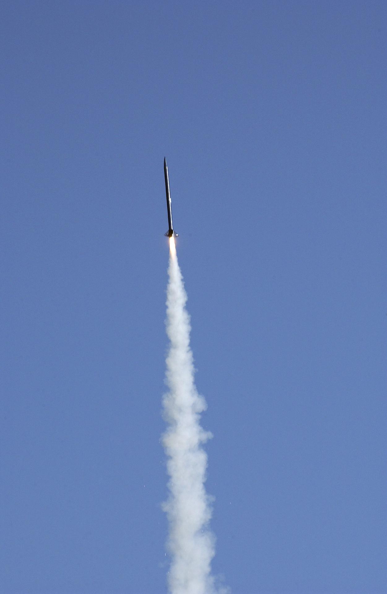 Filled with anticipation, students from two local universities, the University of Alabama in Huntsville (UAH), and Alabama Agricultural Mechanical University (AM), counted down to launch the rockets they designed and built at the Army test site on Redstone Arsenal in Huntsville, Alabama. The projected two-mile high launch culminated more than a year's work and demonstrated the student team's ability to meet the challenge set by the Marshall Space Flight Center's (MSFC) Student Launch Initiative (SLI) program to apply science and math to experience, judgment, and common sense, and proved to NASA officials that they have successfully built reusable launch vehicles (RLVs), another challenge set by NASA's SLI program. MSFC's SLI program is an educational effort that aims to motivate students to pursue careers in science, math, and engineering. It provides the students with hands-on, practical aerospace experience. In this picture, the combined efforts of students from UAH and AM sent this rocket soaring into flight. Students at UAH built the rocket and AM students developed its scientific payload, an experiment that measures the amount of hydrogen produced during electroplating with nickel in a brief period of micrgravity.