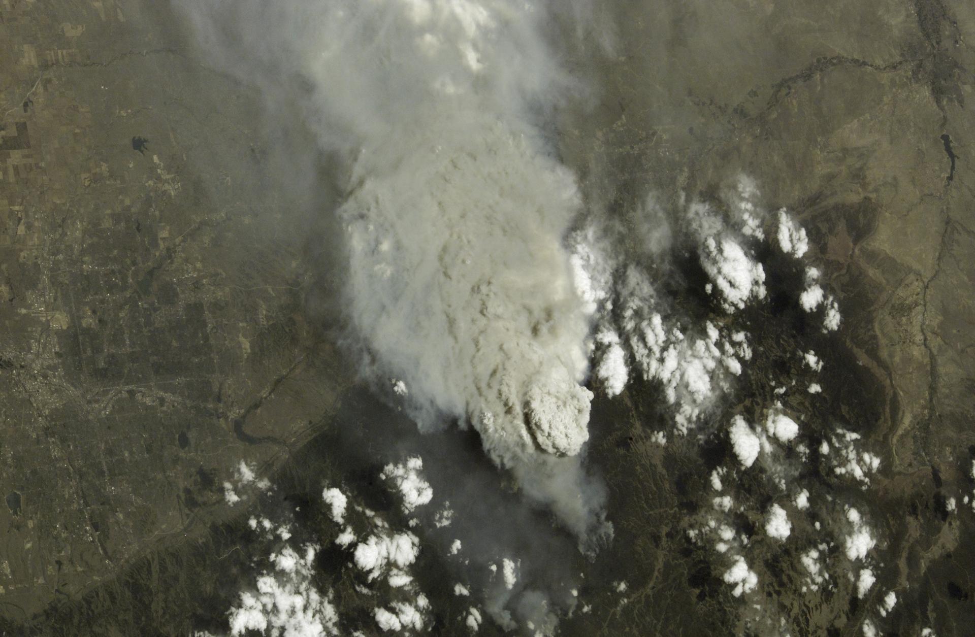 This is a photo of the Hayman Fire burning in the foothills southwest of Denver, Colorado, as viewed by an Expedition Five crewmember aboard the International Space Station (ISS). Astronauts use a variety of lenses and look angles as their orbits pass over the wildfires to document the long-distance movements of smoke from the fires as well as details of the burning areas. In this view, Littleton, Chatfield Lake, and the Arkansas River are all visible.