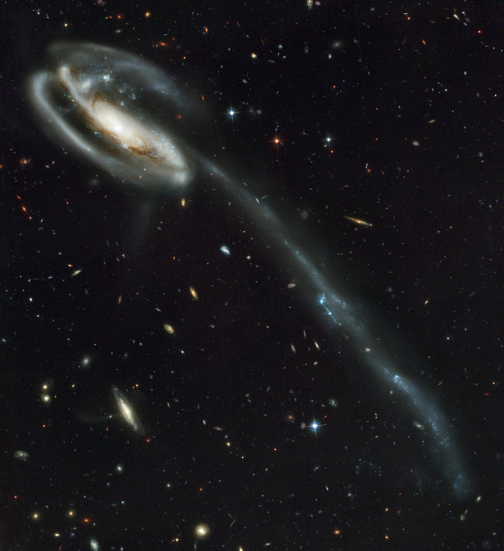 This picture of the galaxy UGC 10214 was was taken by the Advanced Camera for Surveys (ACS), which was installed aboard the Hubble Space Telescope (HST) in March 2002 during HST Servicing Mission 3B (STS-109 mission). Dubbed the "Tadpole," this spiral galaxy is unlike the textbook images of stately galaxies. Its distorted shape was caused by a small interloper, a very blue, compact galaxy visible in the upper left corner of the more massive Tadpole. The Tadpole resides about 420 million light-years away in the constellation Draco. Seen shining through the Tadpole's disk, the tiny intruder is likely a hit-and-run galaxy that is now leaving the scene of the accident. Strong gravitational forces from the interaction created the long tail of debris, consisting of stars and gas that stretch our more than 280,000 light-years. The galactic carnage and torrent of star birth are playing out against a spectacular backdrop: a "wallpaper pattern" of 6,000 galaxies. These galaxies represent twice the number of those discovered in the legendary Hubble Deep Field, the orbiting observatory's "deepest" view of the heavens, taken in 1995 by the Wide Field and planetary camera 2. The ACS picture, however, was taken in one-twelfth of the time it took to observe the original HST Deep Field. In blue light, ACS sees even fainter objects than were seen in the "deep field." The galaxies in the ACS picture, like those in the deep field, stretch back to nearly the begirning of time. Credit: NASA, H. Ford (JHU), G. Illingworth (USCS/LO), M. Clampin (STScI), G. Hartig (STScI), the ACS Science Team, and ESA.