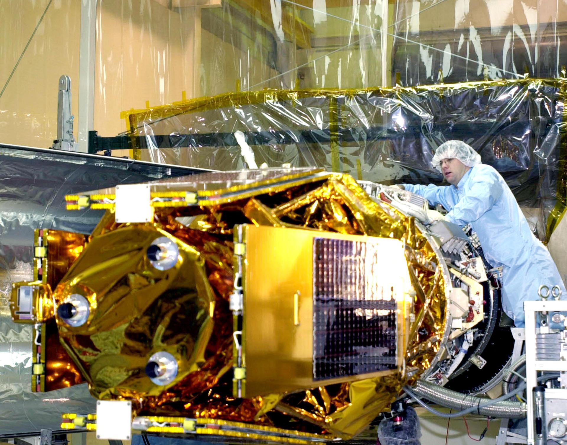 VANDENBERG AFB, CALIF. - A worker prepares the High Energy Solar Spectroscopic Imager (HESSI) for encapsulation atop the Pegasus XL rocket before its transport to Florida. The Pegasus is the vehicle that will launch HESSI on its primary mission to explore the basic physics of particle acceleration and energy release in solar flares. The launch of PegasusXL_HESSI is scheduled for Feb. 5, 2002, from beneath an Orbital Sciences Corp. L-1011 aircraft over the Atlantic Ocean
