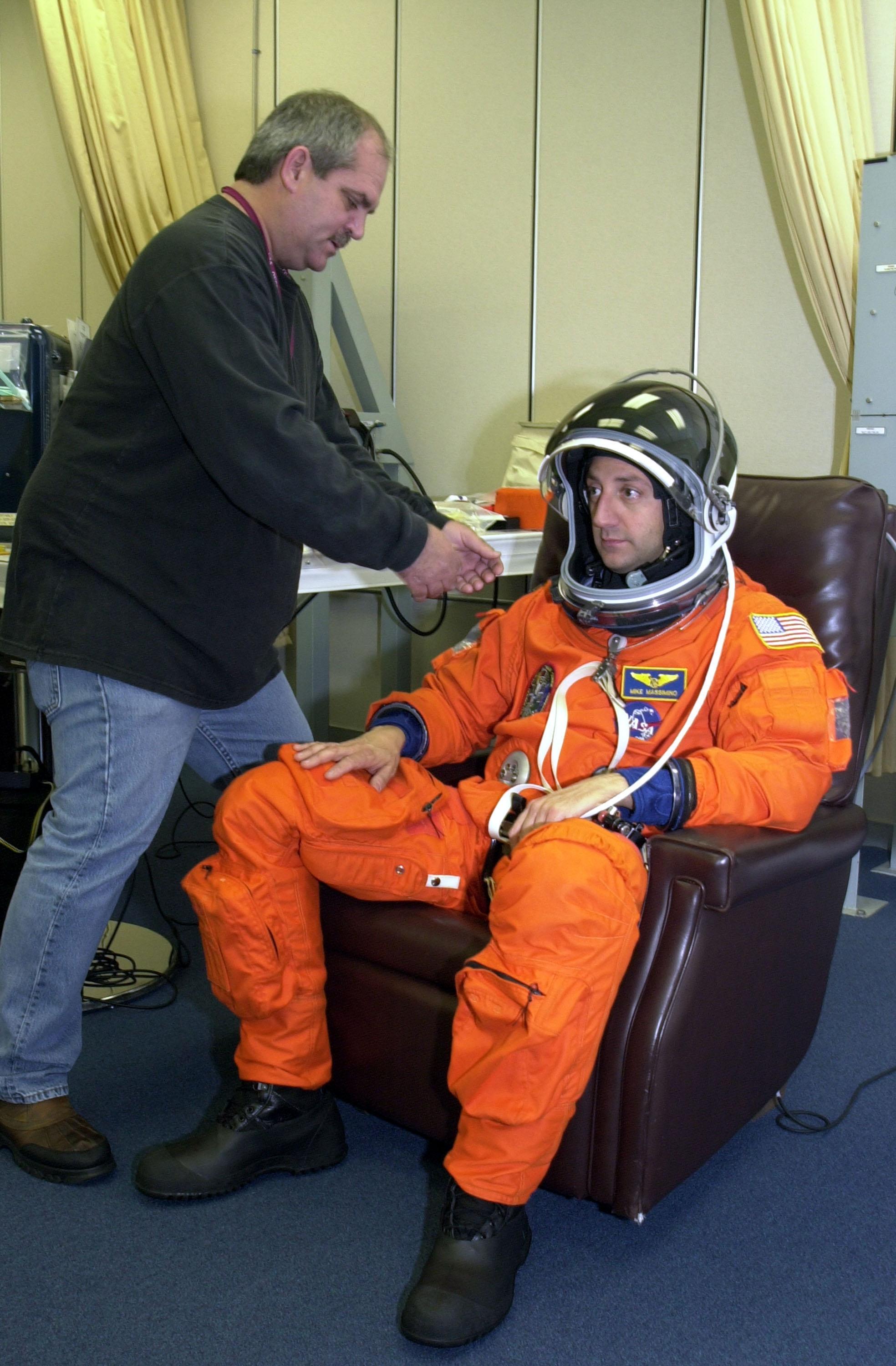 KENNEDY SPACE CENTER, Fla. - STS-109 Mission Specialist Michael J. Massimino gets a final fitting on his launch and entry suit two days before launch. On mission STS-109, the seven-member crew will capture the Hubble Space Telescope using the Shuttle's robotic arm and secure it on a workstand in Columbia's payload bay. Four mission specialists will perform five scheduled spacewalks to complete system upgrades to the telescope. More durable solar arrays, a large gyroscopic assembly to help point the telescope properly, a new telescope power control unit, and a cooling system to restore the use of a key infrared camera and spectrometer unit, which has been dormant since 1999, will all be installed. In addition, the telescope’s view of the Universe will be improved with the addition of the Advanced Camera for Surveys (ACS), which replaces the Faint Object Camera, the last of Hubble's original instruments. The STS-109 crew also includes Commander Scott D. Altman, Pilot Duane G. Carey, and Mission Specialists John M. Grunsfeld, James H. Newman, Nancy J. Currie and Richard M. Linnehan. Launch is scheduled for Feb. 28, 2002, at 6:48 a.m. EST (11:48 GMT)