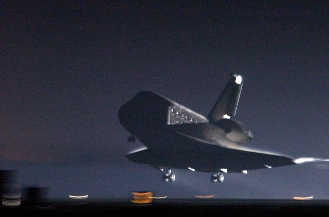 KENNEDY SPACE CENTER, FLA. -- Powerful xenon lights on the Shuttle Landing Facility outline the dark image of orbiter Columbia as it approaches touchdown on Runway 33. The landing completes mission STS-109 to service the Hubble Space Telescope, returning the crew of seven to Earth after a mission elapsed time of 10 days, 22 hours, 11 minutes. Wheel stop occurred on orbit 165 at 4:33:09 a.m. EST. Main gear touchdown occurred at 4:31:52 a.m. and nose wheel touchdown an 4:32:02. It was the 58th landing at KSC out of 108 missions in the history of the Shuttle program
