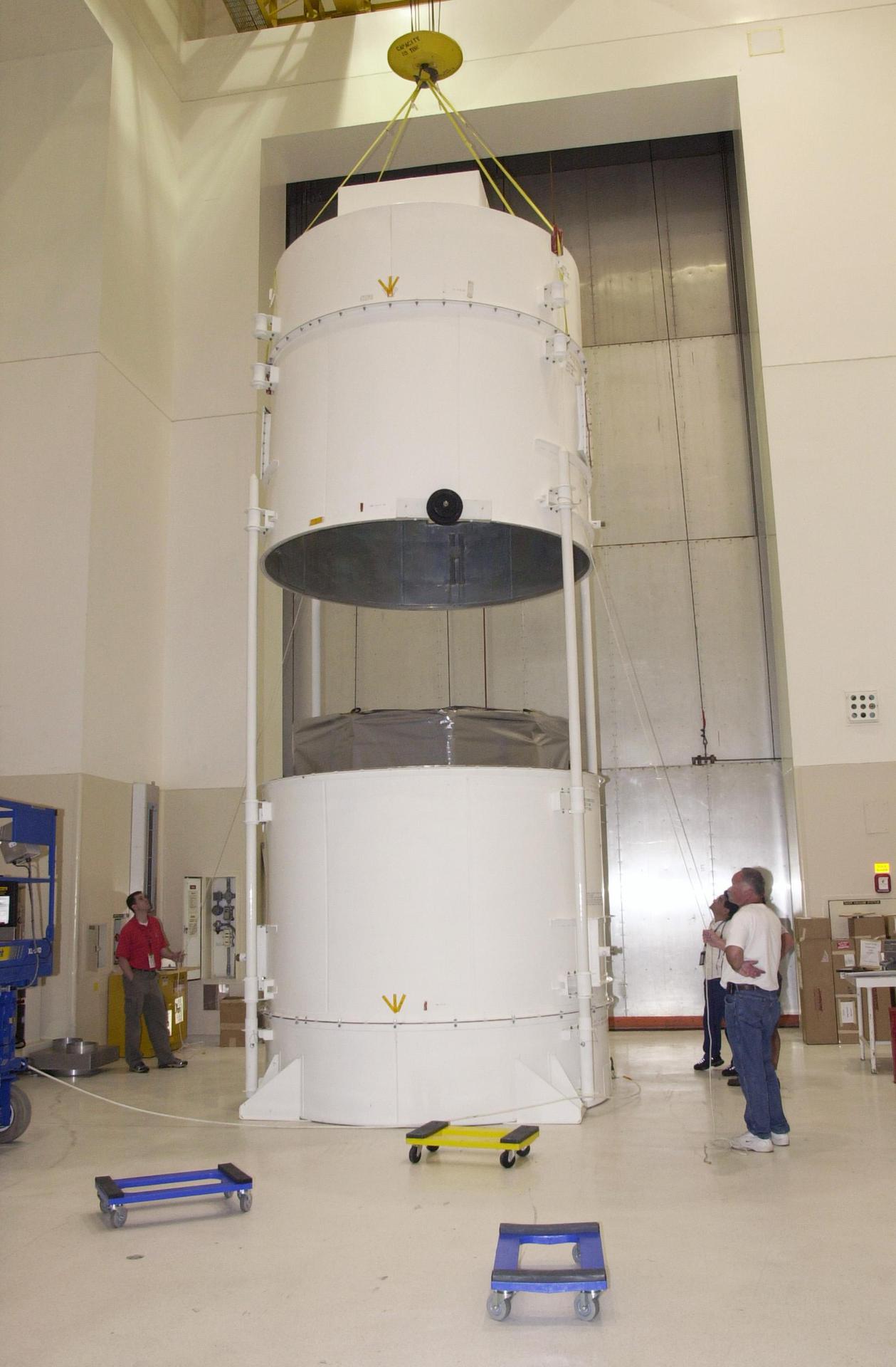 KENNEDY SPACE CENTER, FLA. -- The NASA Comet Nucleus Tour (CONTOUR) spacecraft arrived at KSC on April 24 and was transported to the Spacecraft Assembly and Encapsulation Facility-2 (SAEF-2) to begin final preparations for launch. CONTOUR will provide the first detailed look into the heart of a comet - the nucleus. The spacecraft will fly as close as 60 miles (100 kilometers) to at least two comets, Encke and Schwassmann-Wachmann 3, taking the sharpest pictures yet of the nucleus while analyzing the gas and dust that surround these rocky, icy building blocks of the solar system. The Applied Physics Laboratory of Johns Hopkins University, Baltimore, Md., built CONTOUR and will also be in control of the spacecraft after launch, scheduled for July 1, 2002, from LC 17A at Cape Canaveral Air Force Station