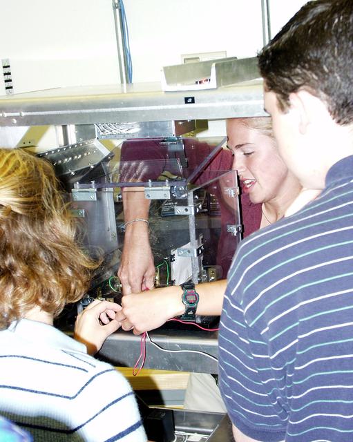 Students prepare their experiment apparatus for free-fall during the second Dropping in a Microgravity Environment (DIME) competition held April 23-25, 2002, at NASA's Glenn Research Center. Competitors included two teams from Sycamore High School, Cincinnati, OH, and one each from Bay High School, Bay Village, OH, and COSI Academy, Columbus, OH. DIME is part of NASA's education and outreach activities. Details are on line at http://microgravity.grc.nasa.gov/DIME_2002.html.