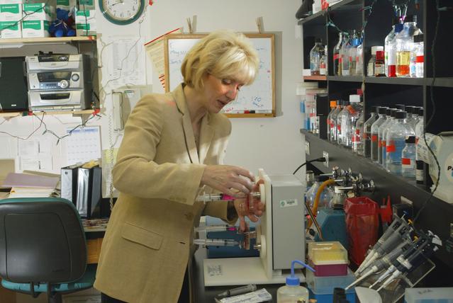 Dr. Cheryl Nickerson of Tulane University is studying the effects of simulated low-g on a well-known pathogen, Salmonella typhimurium, a bacterium that causes two to four million cases of gastrointestinal illness in the United States each year. While most healthy people recover readily, S. typhimurium can kill people with weakened immune systems. Thus, a simple case of food poisoning could disrupt a space mission. Using the NASA rotating-wall bioreactor, Nickerson cultured S. typhimurium in modeled microgravity. Mice infected with the bacterium died an average of three days faster than the control mice, indicating that S. typhimurium's virulence was enhanced by the bioreactor. Earlier research showed that 3 percent of the genes were altered by exposure to the bioreactor. Nickerson's work earned her a 2001 Presidential Early Career Award for Scientists and Engineers.