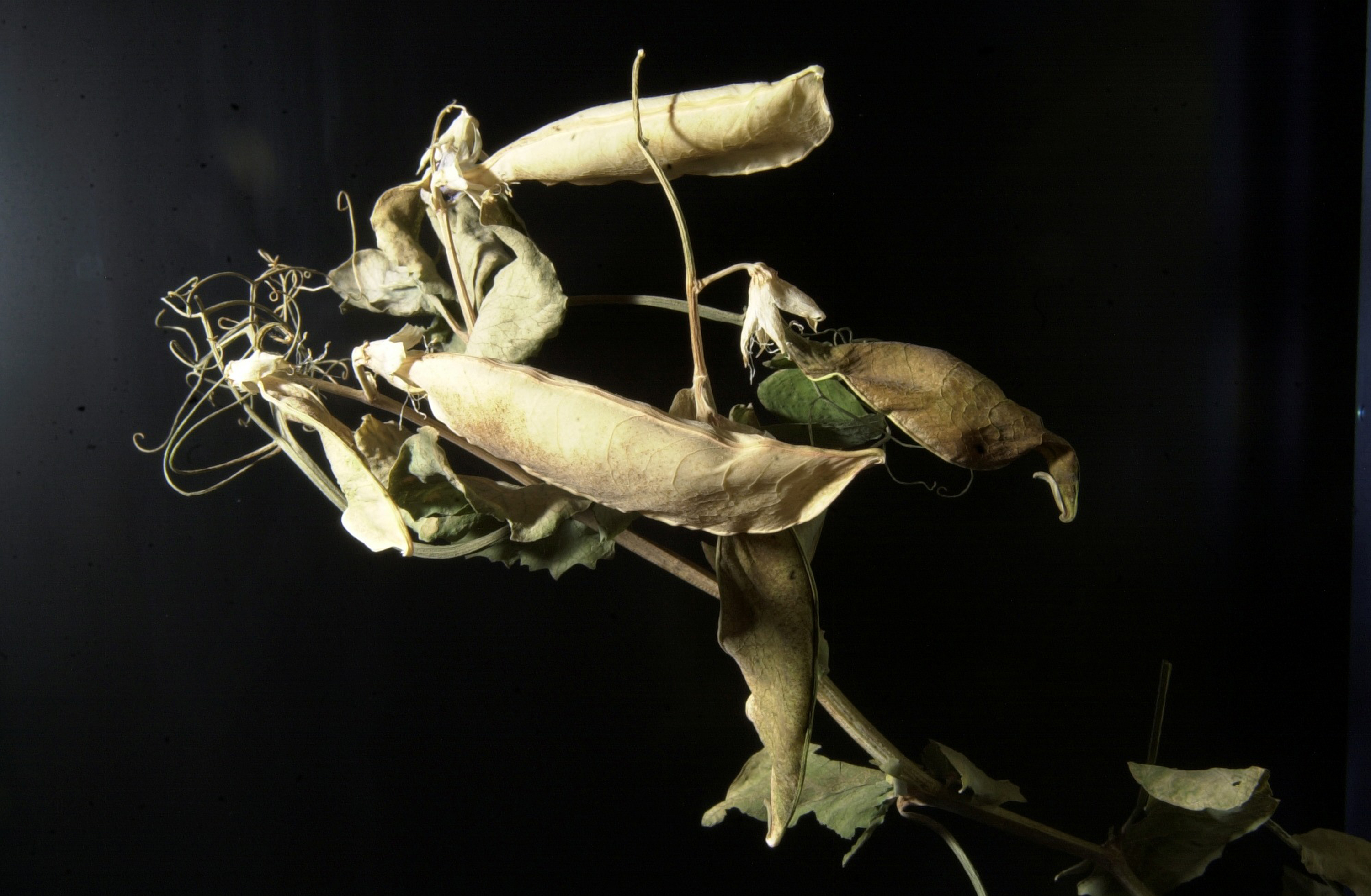 Aboard the International Space Station (ISS), the Russian Lada greenhouse provides home to an experiment that investigates plant development and genetics. Space grown peas have dried and "gone to seed." The crew of the ISS will soon harvest the seeds. Eventually some will be replanted onboard the ISS, and some will be returned to Earth for further study.
