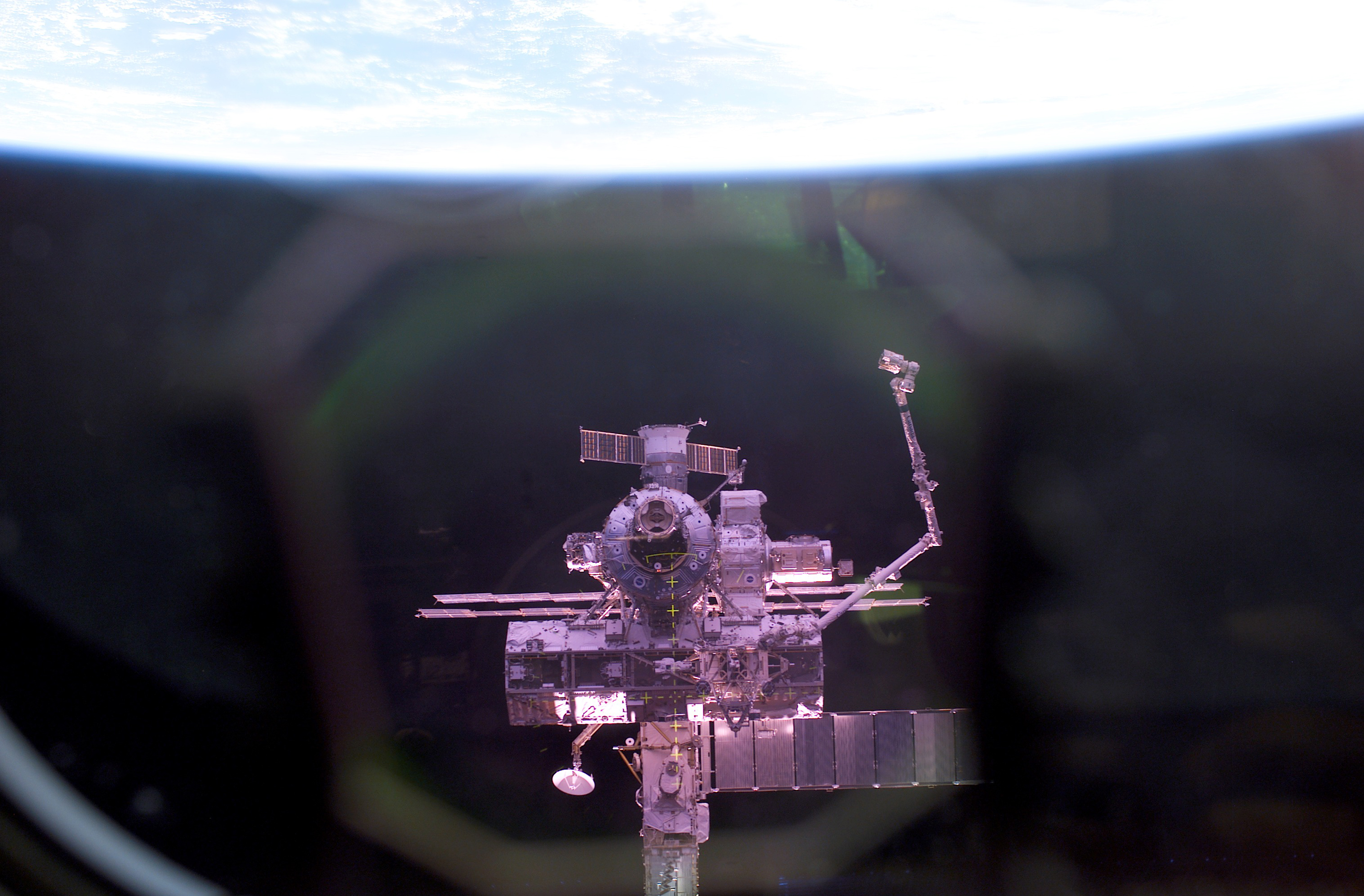 This view of the International Space Station (ISS) was photographed by an STS-112 crew member aboard the Space Shuttle Atlantis during rendezvous and docking operations. Launched October 7, 2002 aboard the Space Shuttle Orbiter Atlantis, the STS-112 mission lasted 11 days and performed three sessions of Extra Vehicular Activity (EVA). Its primary mission was to install the Starboard (S1) Integrated Truss Structure and Equipment Translation Aid (CETA) Cart to the ISS. The S1 truss provides structural support for the orbiting research facility's radiator panels, which use ammonia to cool the Station's complex power system. The S1 truss, attached to the S0 (S Zero) truss, installed by the previous STS-110 mission, flows 637 pounds of anhydrous ammonia through three heat rejection radiators. The truss is 45-feet long, 15-feet wide, 10-feet tall, and weighs approximately 32,000 pounds. The CETA is the first of two human-powered carts that will ride along the railway on the ISS providing a mobile work platform for future extravehicular activities by astronauts.