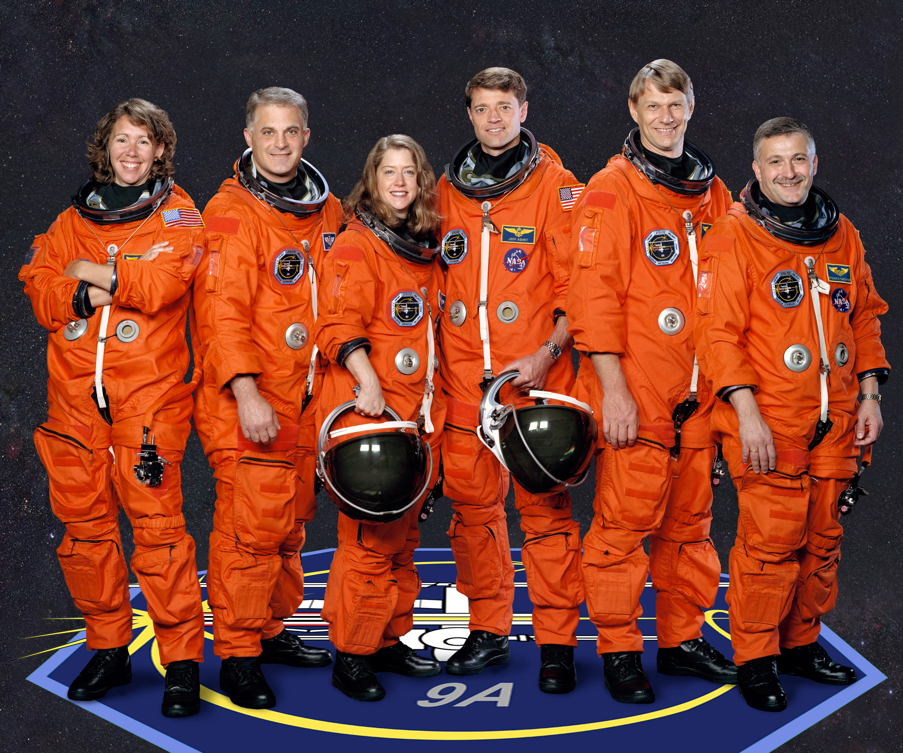 These 5 astronauts and cosmonaut, all members of the STS-112 mission, pose for a crew portrait. Pictured from left to right are: Astronauts Sandra H. Magnus, mission specialist; David A. Wolf, mission specialist; Pamela A. Melroy, pilot; Jeffrey S. Ashby, commander; Piers J. Sellers, mission specialist; and cosmonaut Fyodor Yurchikhin, mission specialist representing Rosaviakosmos. STS-112 launched aboard the Space Shuttle Atlantis October 7, 2002 for an 11-day mission completing three sessions of Extra Vehicular Activity(EVA). Its primary mission was to install the Starboard (S1) Integrated Truss Structure and Equipment Translation Aid (CETA) Cart to the ISS. The S1 truss provides structural support for the orbiting research facility's radiator panels, which use ammonia to cool the Station's complex power system. The S1 truss, attached to the S0 (S Zero) truss installed by the previous STS-110 mission, flows 637 pounds of anhydrous ammonia through three heat rejection radiators. The truss is 45-feet long, 15-feet wide, 10-feet tall, and weighs approximately 32,000 pounds. The CETA is the first of two human-powered carts that will ride along the railway on the ISS providing a mobile work platform for future extravehicular activities by astronauts.
